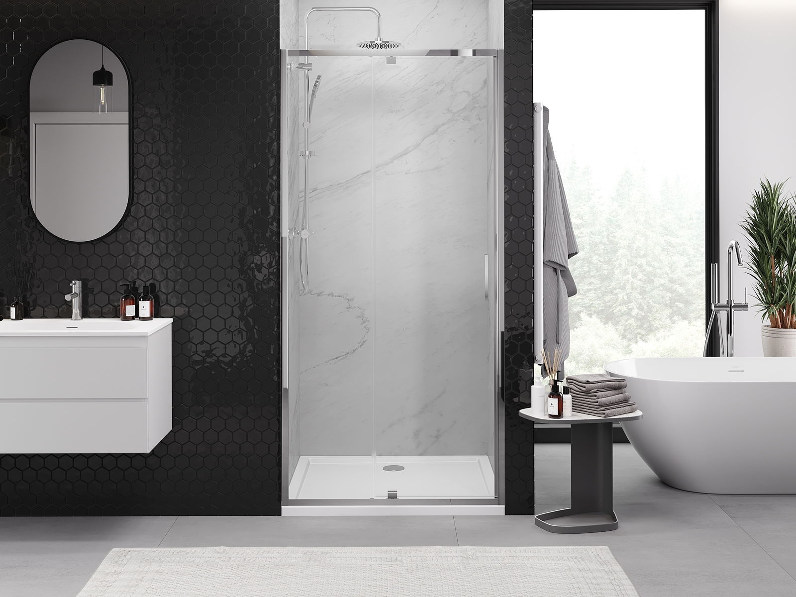 La poignée pratique et confortable est fabriquée en métal durable et résistant. Sa forme à la mode, combinée à une finition assortie à la couleur des profilés, donne à l'ensemble un aspect moderne et stylé, soulignant l'esthétique de chaque salle de bain.