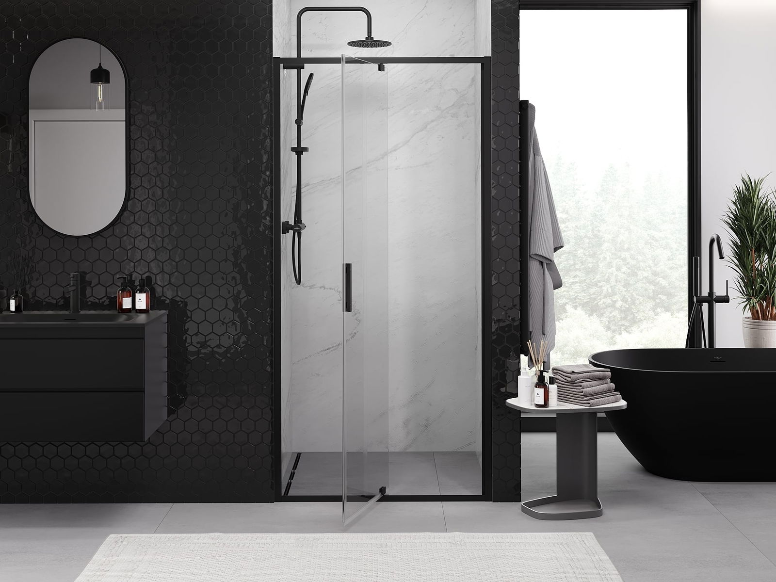 La poignée pratique et confortable est fabriquée en métal durable et résistant. Sa forme à la mode, combinée à une finition assortie à la couleur des profilés, donne à l'ensemble un aspect moderne et stylé, soulignant l'esthétique de chaque salle de bain.