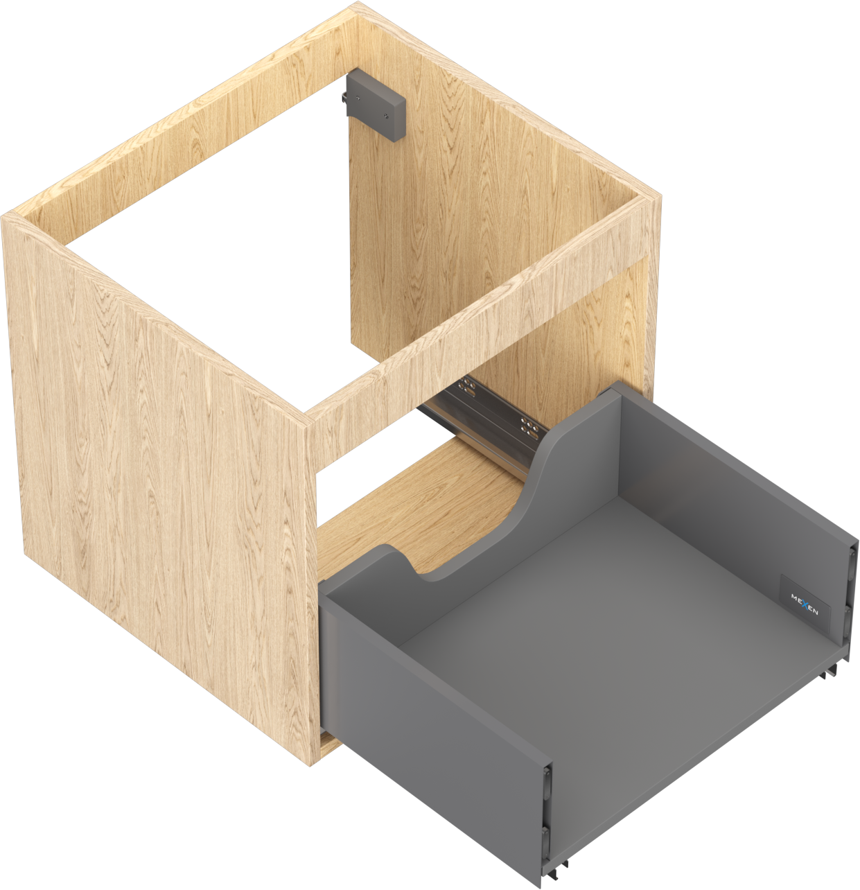 La découpe dans le tiroir est conçue de manière à accueillir le siphon, qui est nécessaire dans les installations de lavabo. Ainsi, le meuble peut être installé de manière pleinement fonctionnelle, sans devoir renoncer à l'espace du tiroir au profit de l'installation.