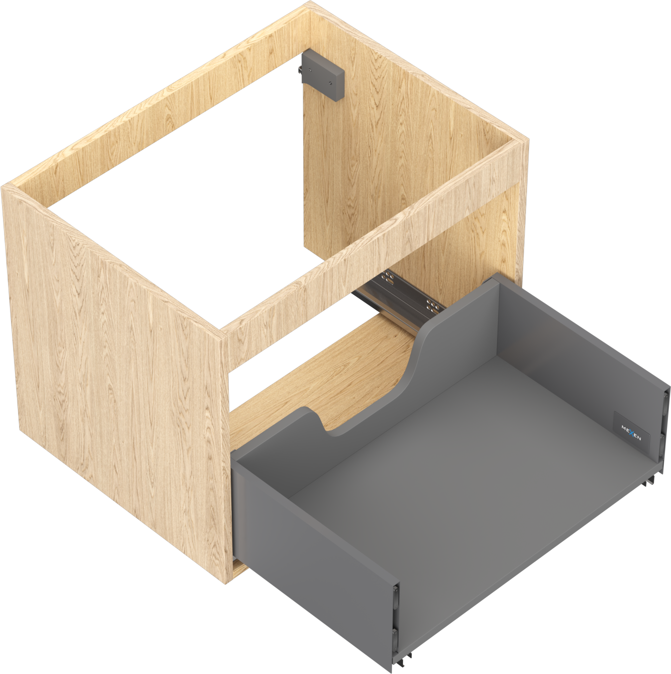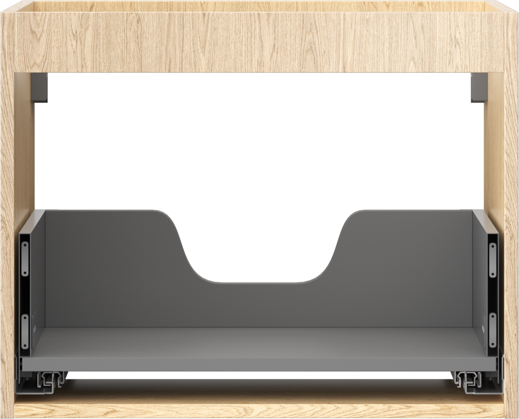 La découpe dans le tiroir est conçue de manière à accueillir le siphon, qui est nécessaire dans les installations de lavabo. Ainsi, le meuble peut être installé de manière pleinement fonctionnelle, sans devoir renoncer à l'espace du tiroir au profit de l'installation.