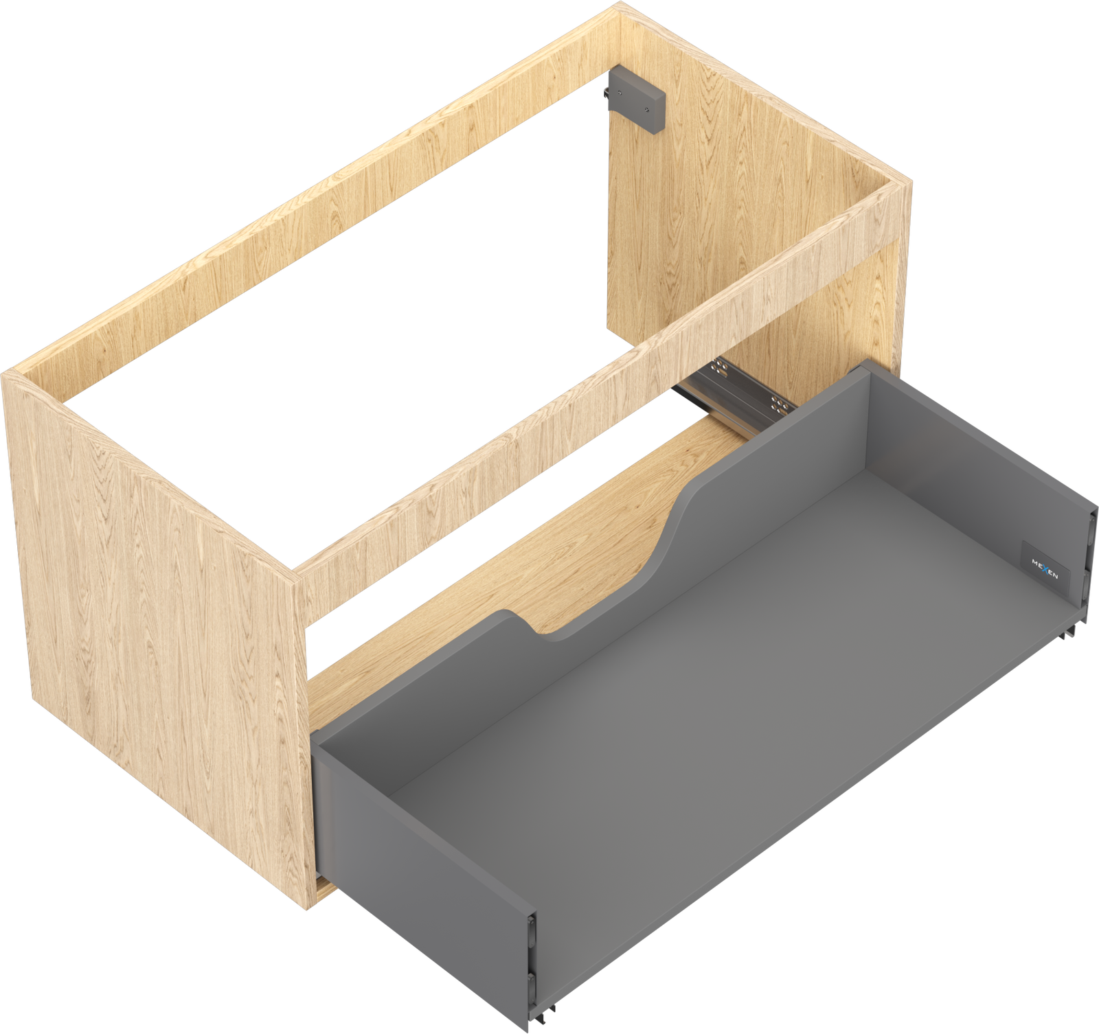 La découpe dans le tiroir est conçue de manière à accueillir le siphon, qui est nécessaire dans les installations de lavabo. Ainsi, le meuble peut être installé de manière pleinement fonctionnelle, sans devoir renoncer à l'espace du tiroir au profit de l'installation.