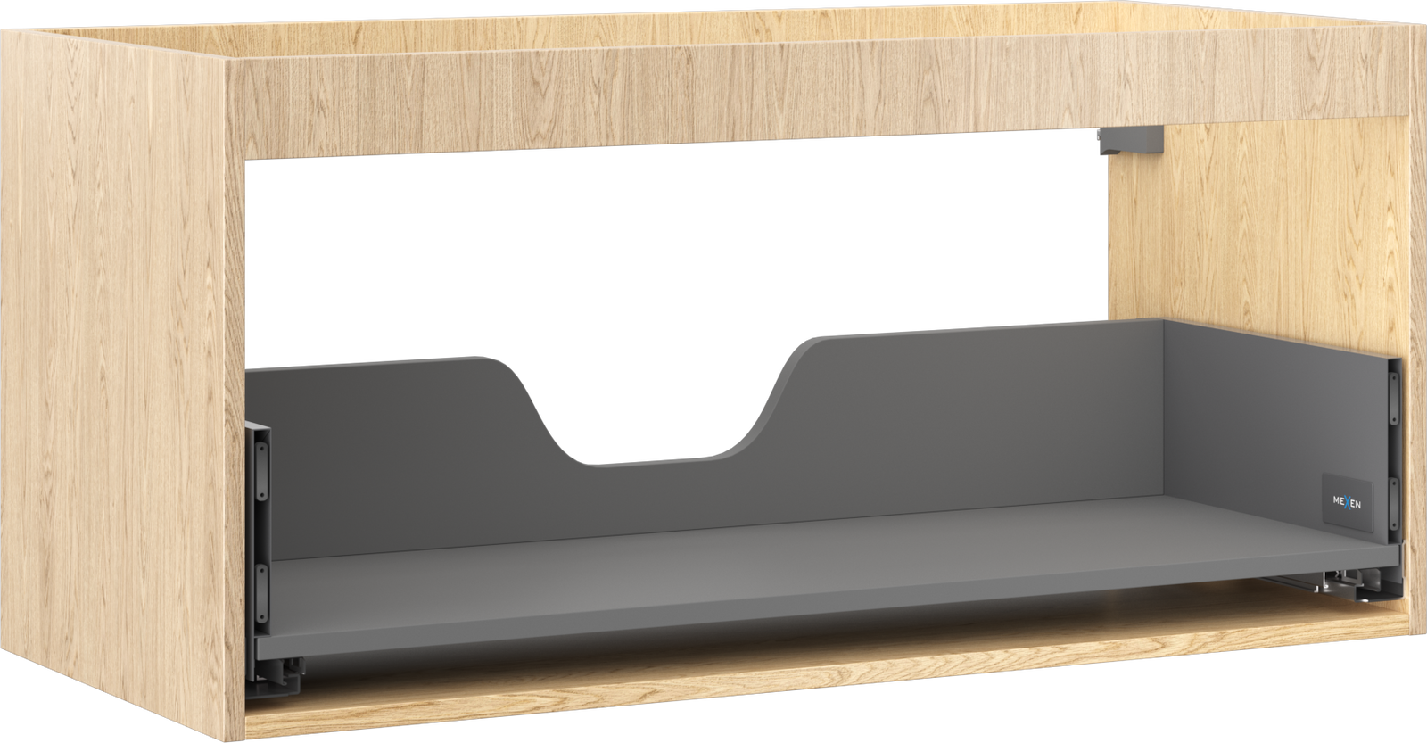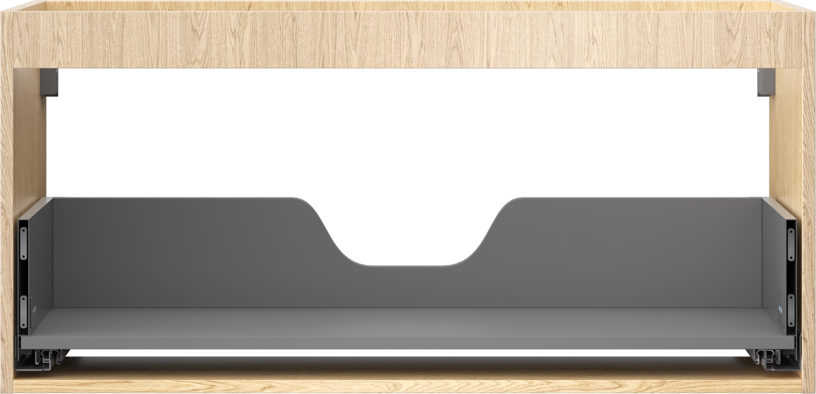 La découpe dans le tiroir est conçue de manière à accueillir le siphon, qui est nécessaire dans les installations de lavabo. Ainsi, le meuble peut être installé de manière pleinement fonctionnelle, sans devoir renoncer à l'espace du tiroir au profit de l'installation.