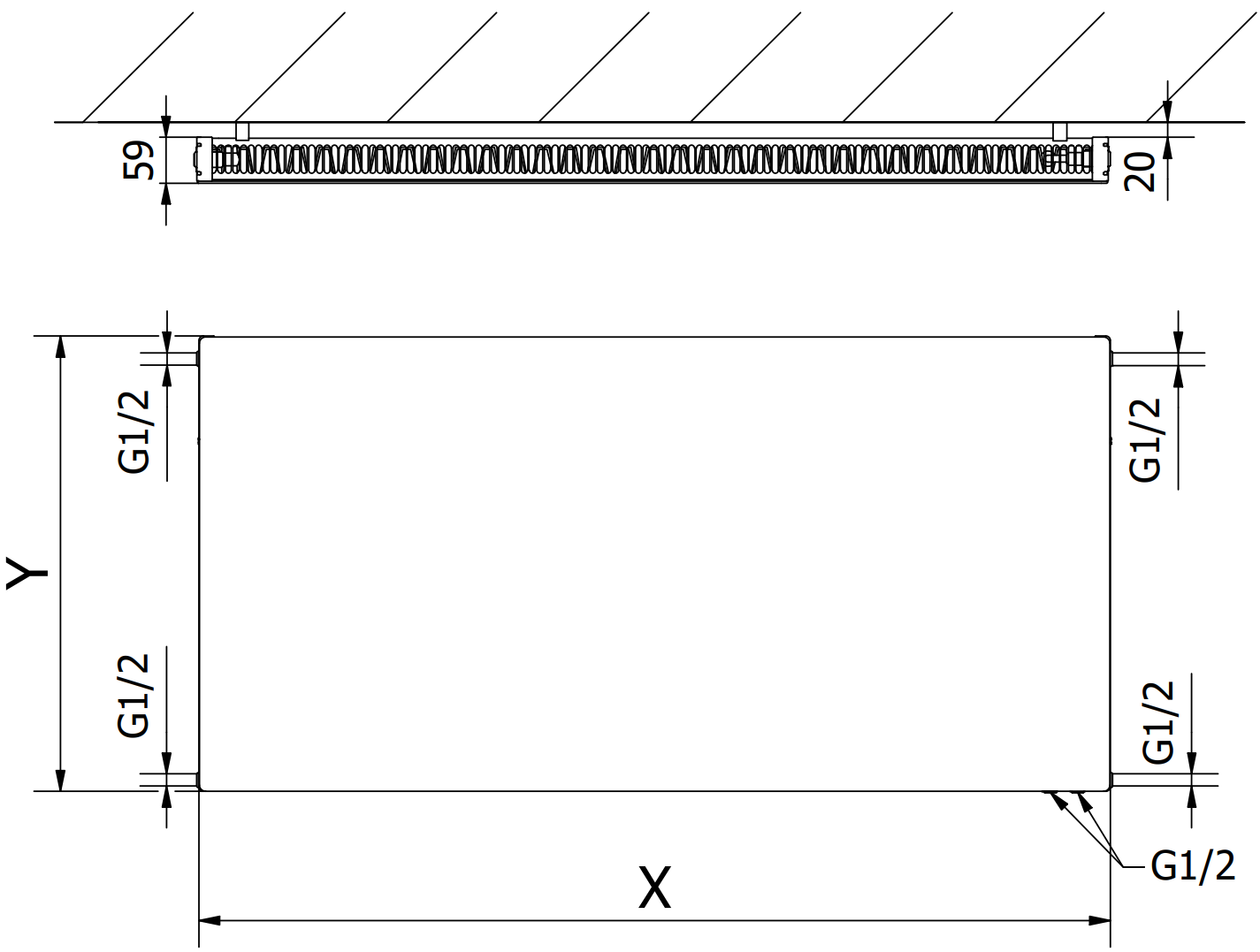 Les images montrent le radiateur en taille 600 x 1200 mm.