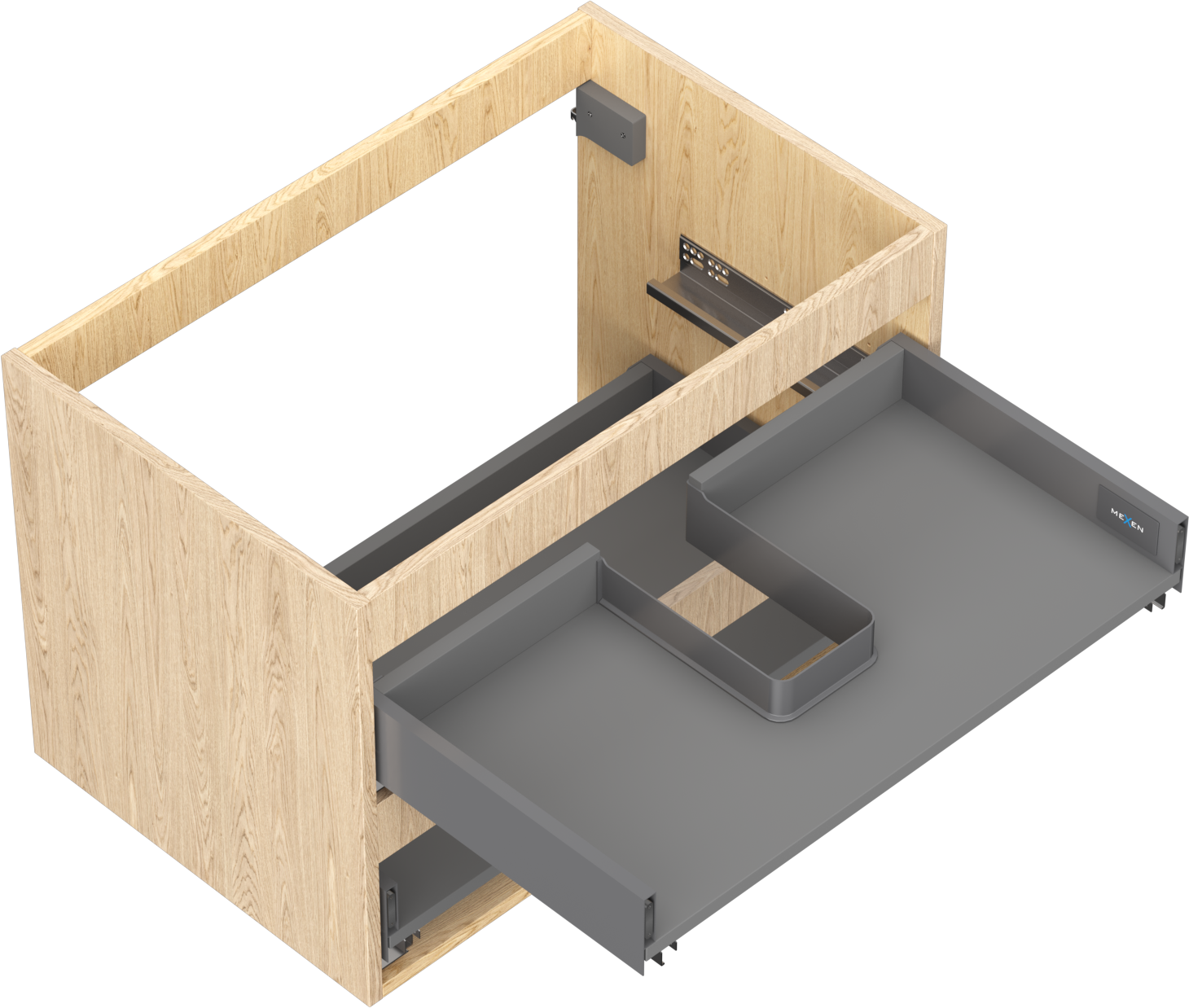 La découpe dans le tiroir est conçue de manière à accueillir le siphon, qui est nécessaire dans les installations de lavabo. Ainsi, le meuble peut être installé de manière pleinement fonctionnelle, sans devoir renoncer à l'espace du tiroir au profit de l'installation.
