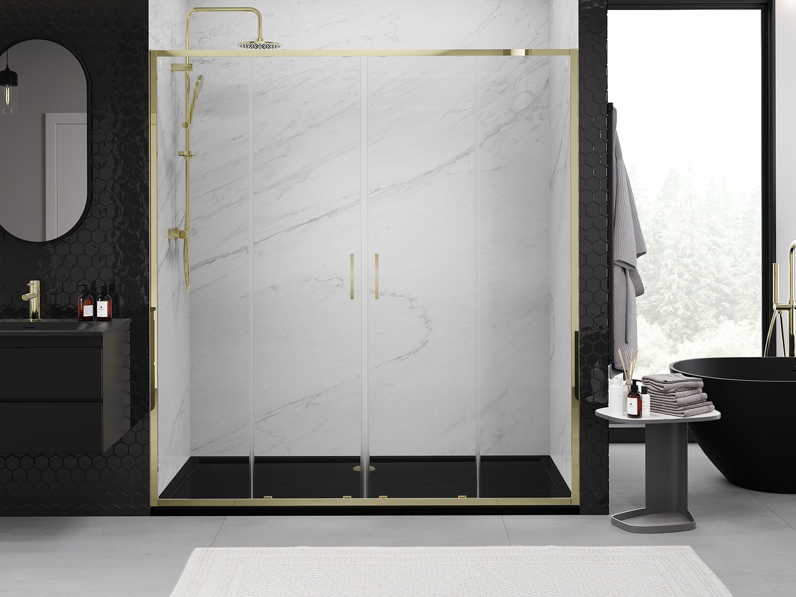 La poignée pratique et confortable est fabriquée en métal durable et résistant. Sa forme à la mode, combinée à une finition assortie à la couleur des profilés, donne à l'ensemble un aspect moderne et stylé, soulignant l'esthétique de chaque salle de bain.