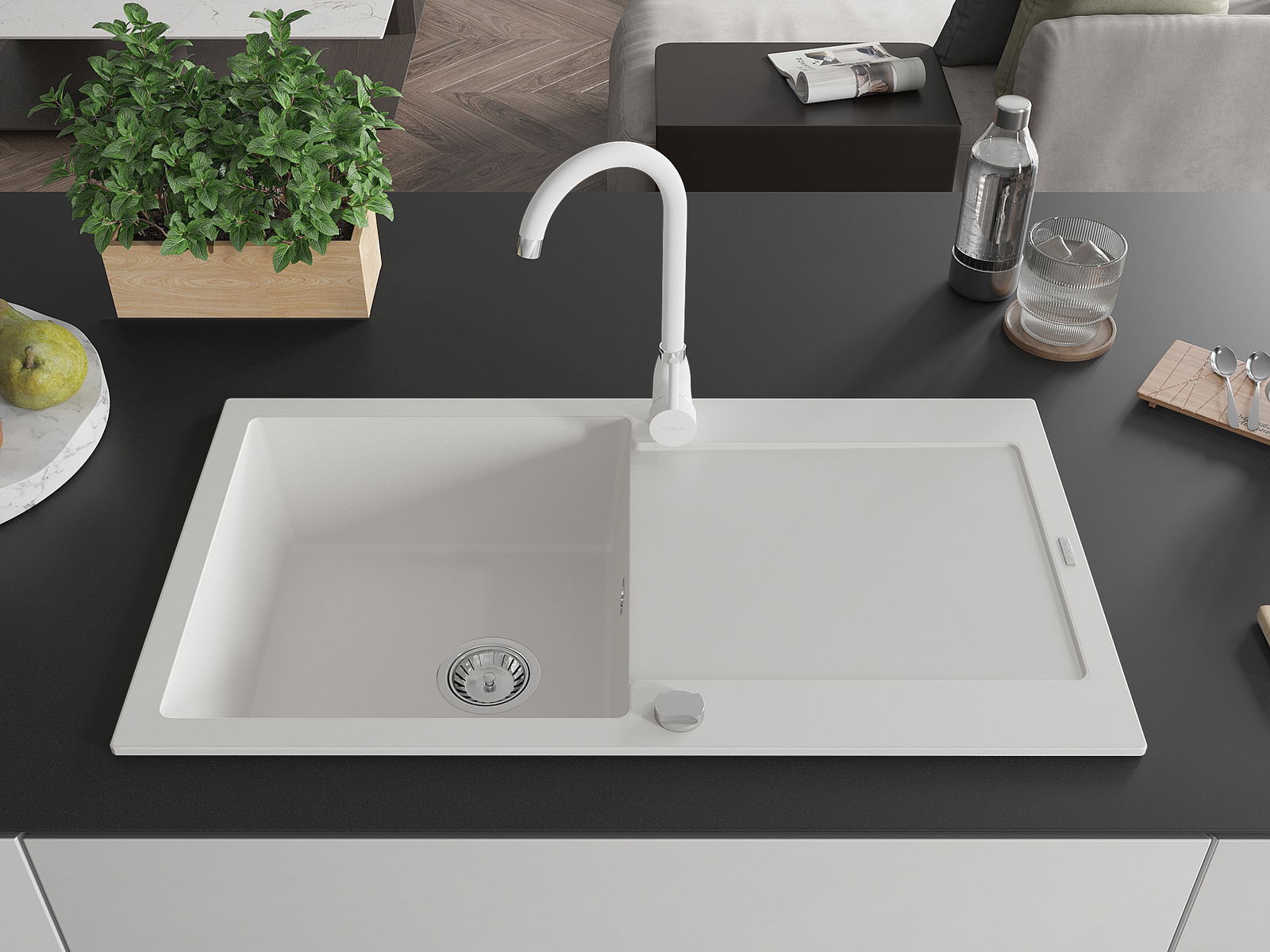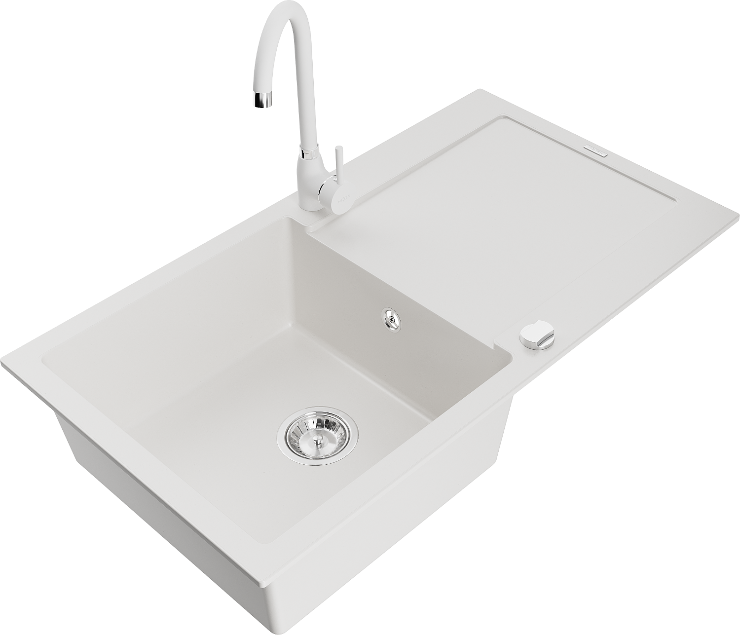 Mexen Leo évier en granit 1 bac avec égouttoir et robinet de cuisine Telma, blanc - 6501-20-670200-20