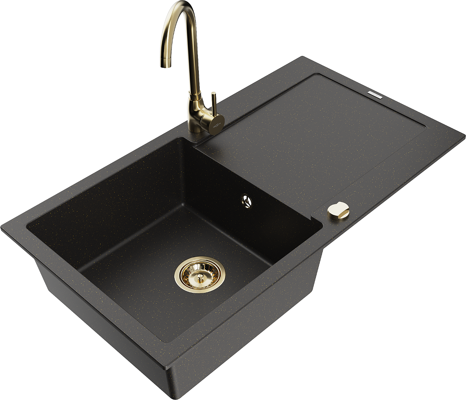 Mexen Leo évier en granit 1 bac avec égouttoir et robinet de cuisine Telma, noir/or métallisé - 6501-75-670200-50