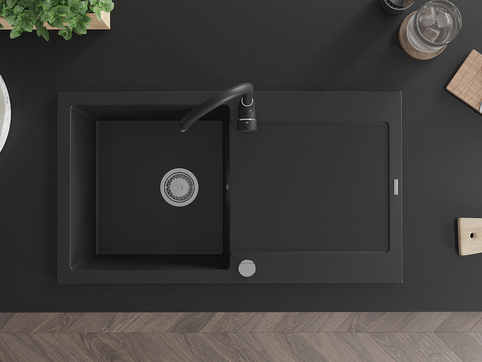 Mexen Leo évier de cuisine en granit à 1 bac avec égouttoir et robinet de cuisine Telma, noir - 6501-77-670200-70