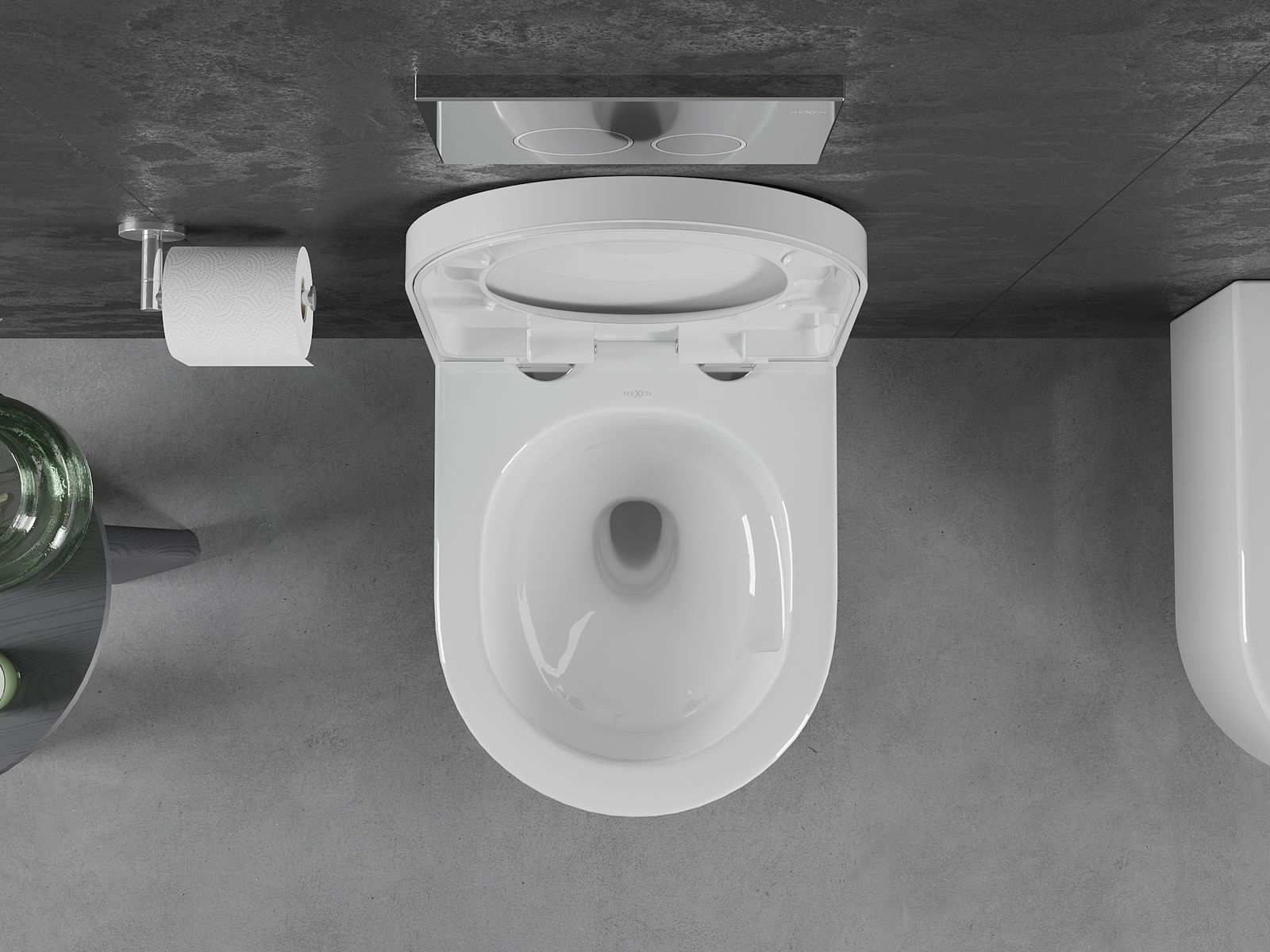 Système caractérisé par l'absence de rebord traditionnel (sans rebord) et un système de rinçage en spirale spécifique qui rappelle un tourbillon. L'eau de rinçage crée un effet "tornado", nettoyant rapidement et efficacement toute la surface de la cuvette, ce qui aide à mieux la purifier et empêche la saleté de s'y déposer.