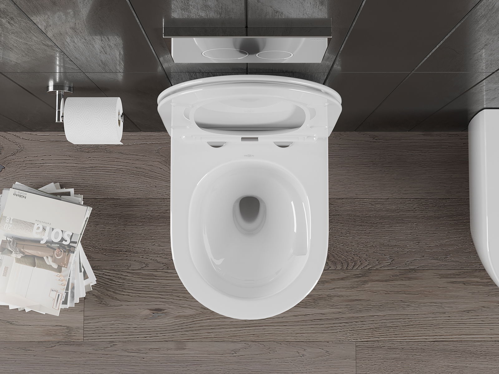 Système caractérisé par l'absence de rebord traditionnel (sans rebord) et un système de rinçage en spirale spécifique qui rappelle un tourbillon. L'eau de rinçage crée un effet "tornado", nettoyant rapidement et efficacement toute la surface de la cuvette, ce qui aide à mieux la purifier et empêche la saleté de s'y déposer.