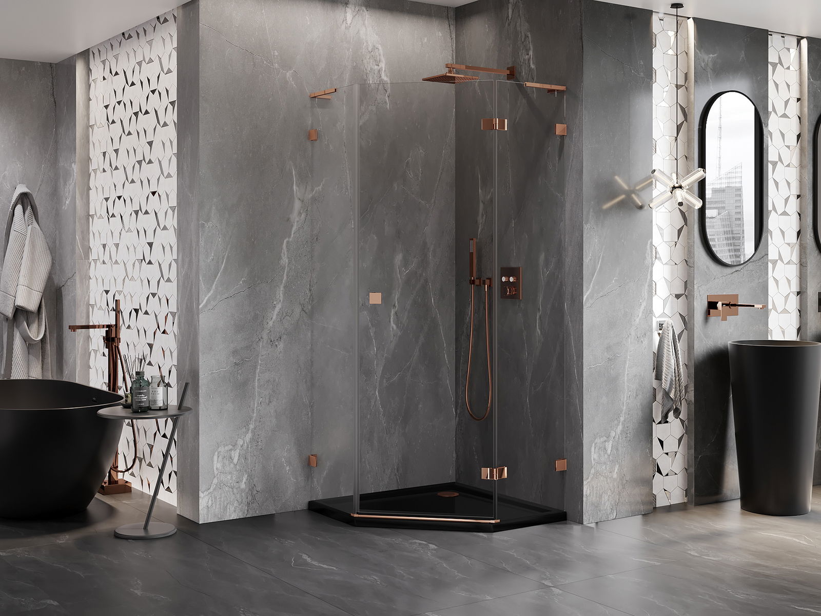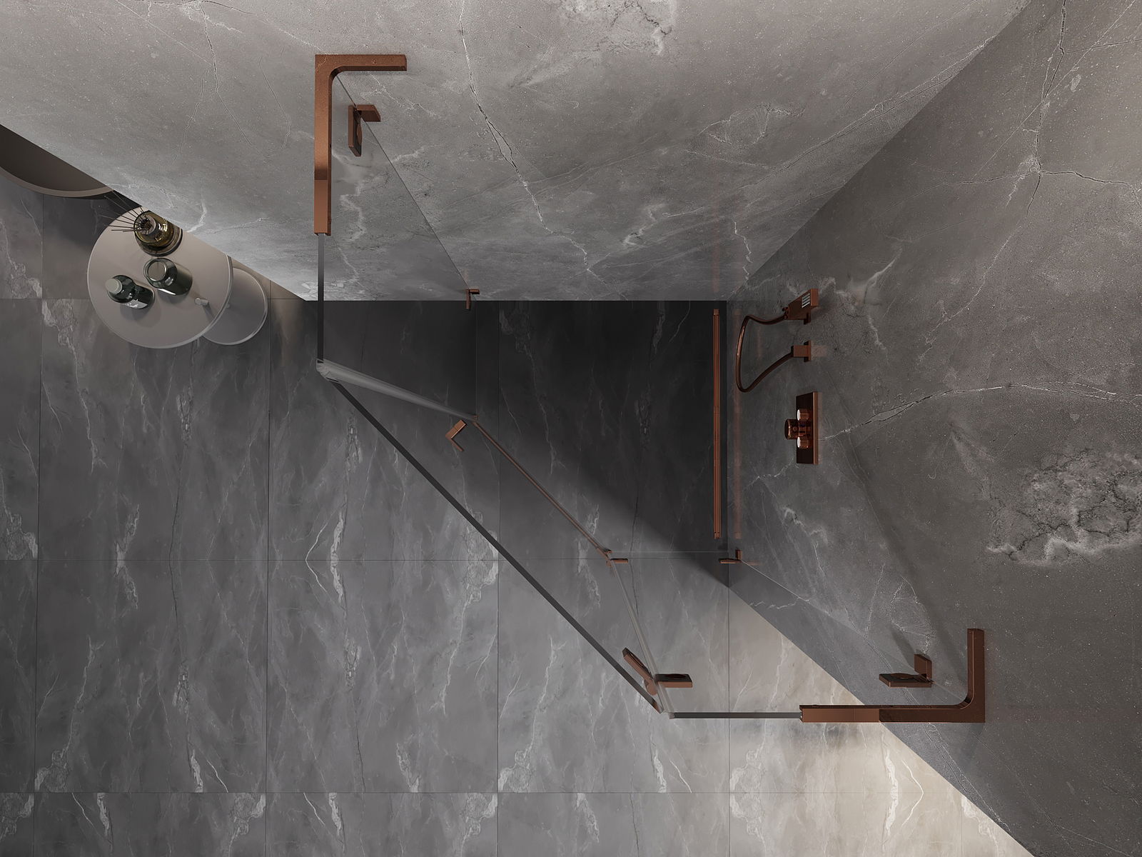 Mexen Lunar L cabine de douche pentagonale pivotante droite 100 x 100 cm, transparent, or rose - 831L-100P-100L-60-00-P