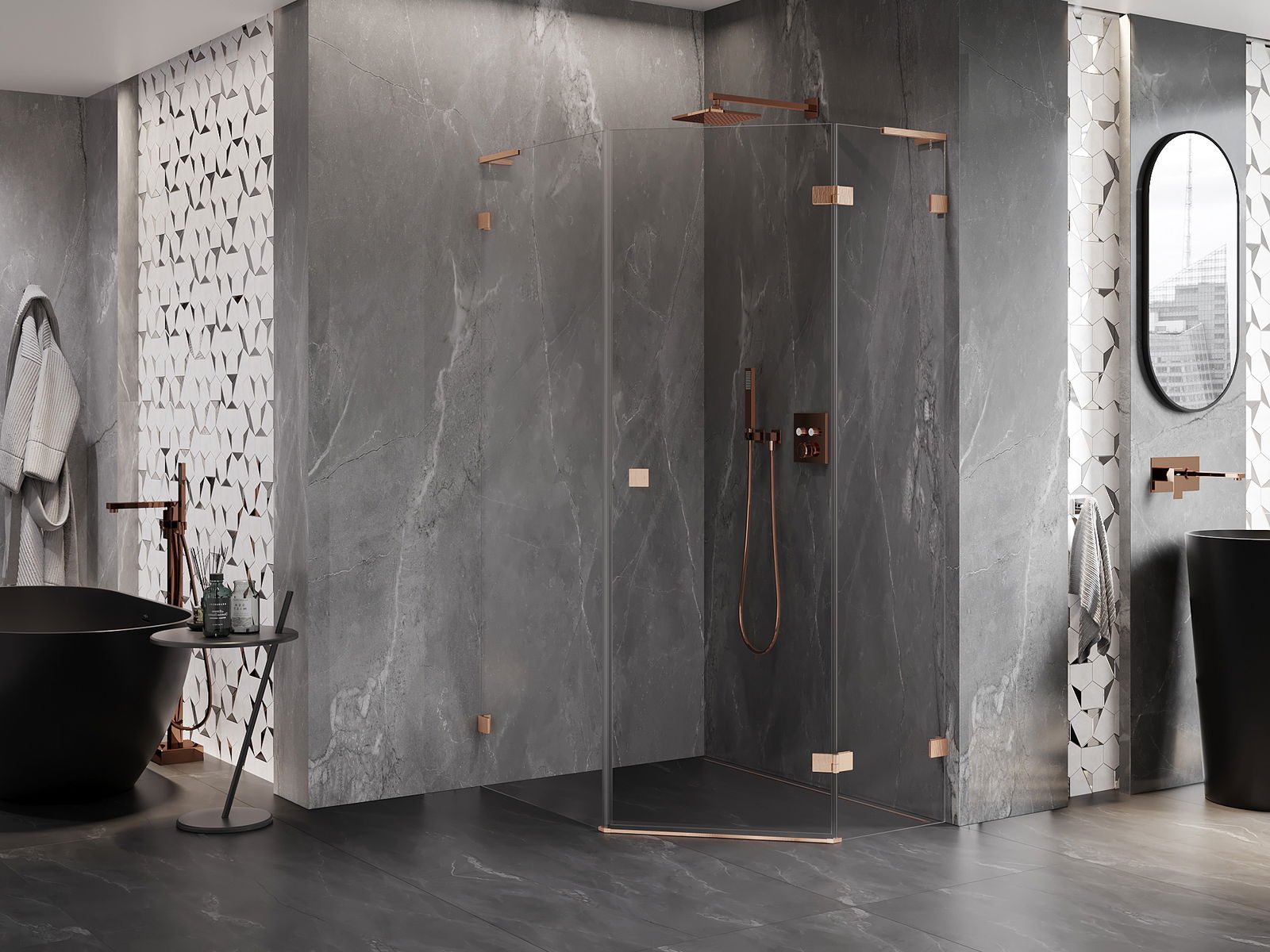 Mexen Lunar L cabine de douche pentagonale à charnière droite 80 x 100 cm, transparent, cuivre brossé - 831L-080P-100L-65-00-P