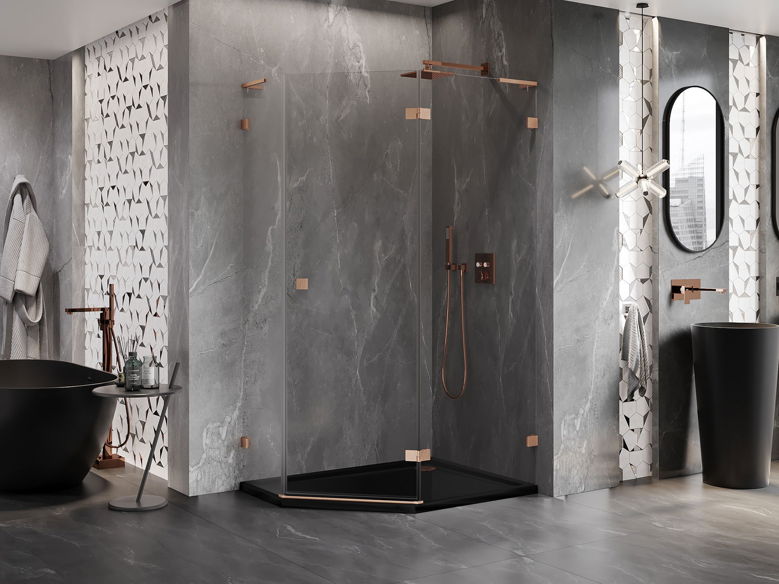 Mexen Lunar L cabine de douche pentagonale pivotante droite 100 x 80 cm, transparent, cuivre brossé - 831L-100P-080L-65-00-P