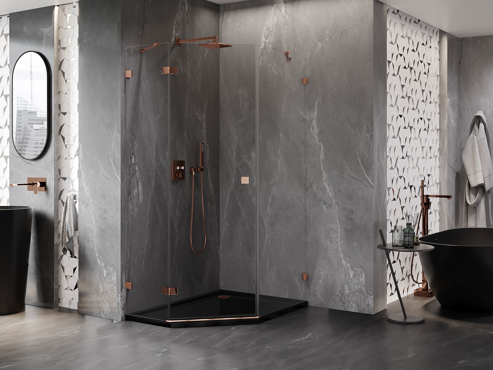 Mexen Lunar cabine de douche pentagonale à charnière gauche 80 x 90 cm, transparent, or rose - 831-080L-090P-60-00-L