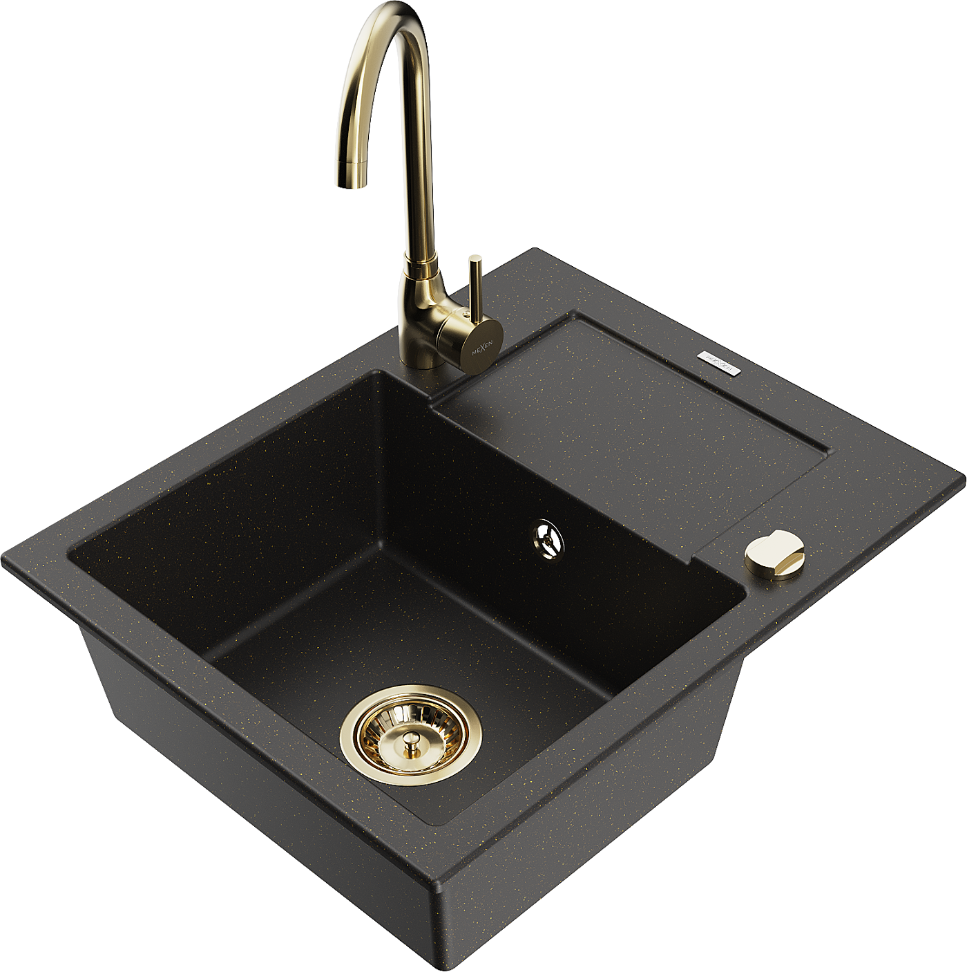 Mexen Enzo évier en granit à 1 bac avec égouttoir et mitigeur de cuisine Telma, noir/or - 6506-75-670200-50