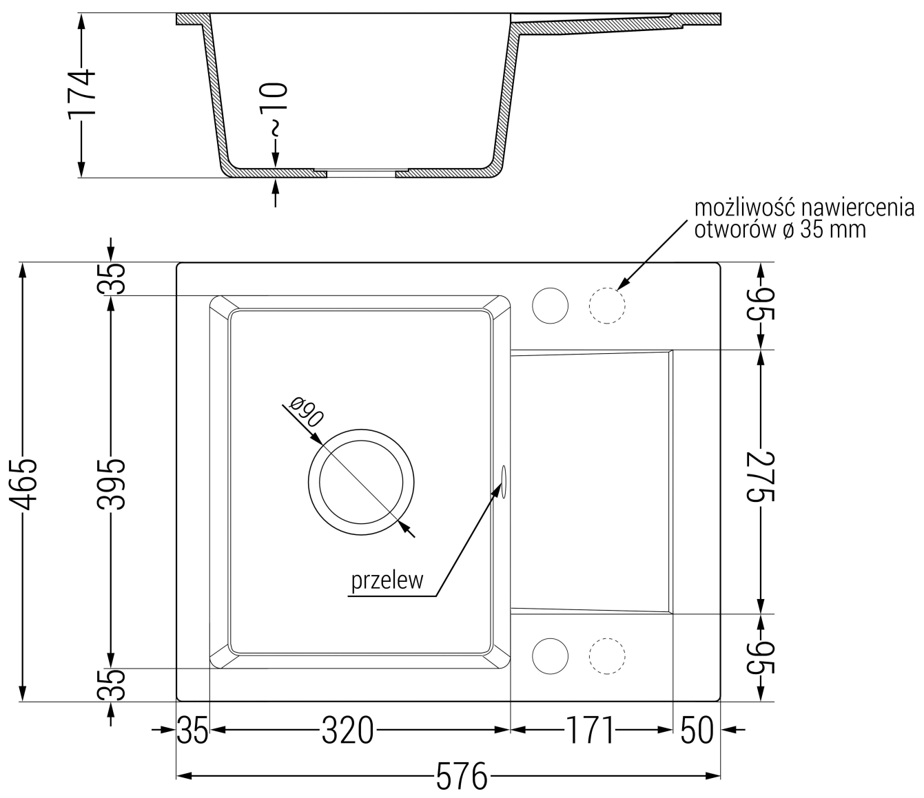 L'évier dispose de 2 trous pré-percés de 35 mm de diamètre, à percer soi-même. Ils peuvent être utilisés, entre autres, pour l'installation d'un distributeur de liquide, qui éliminera la présence de bouteilles en plastique dans la cuisine et lui donnera une finition élégante.
