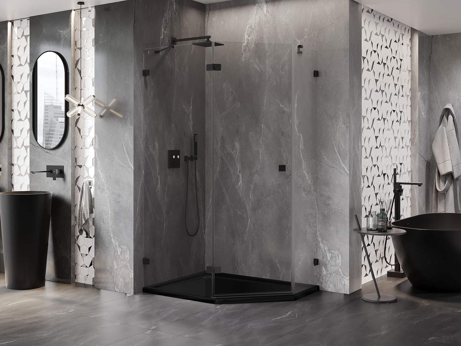 Mexen Lunar cabine de douche pentagonale pivotante gauche 100 x 80 cm, transparent, noir - 831-100L-080P-70-00-L