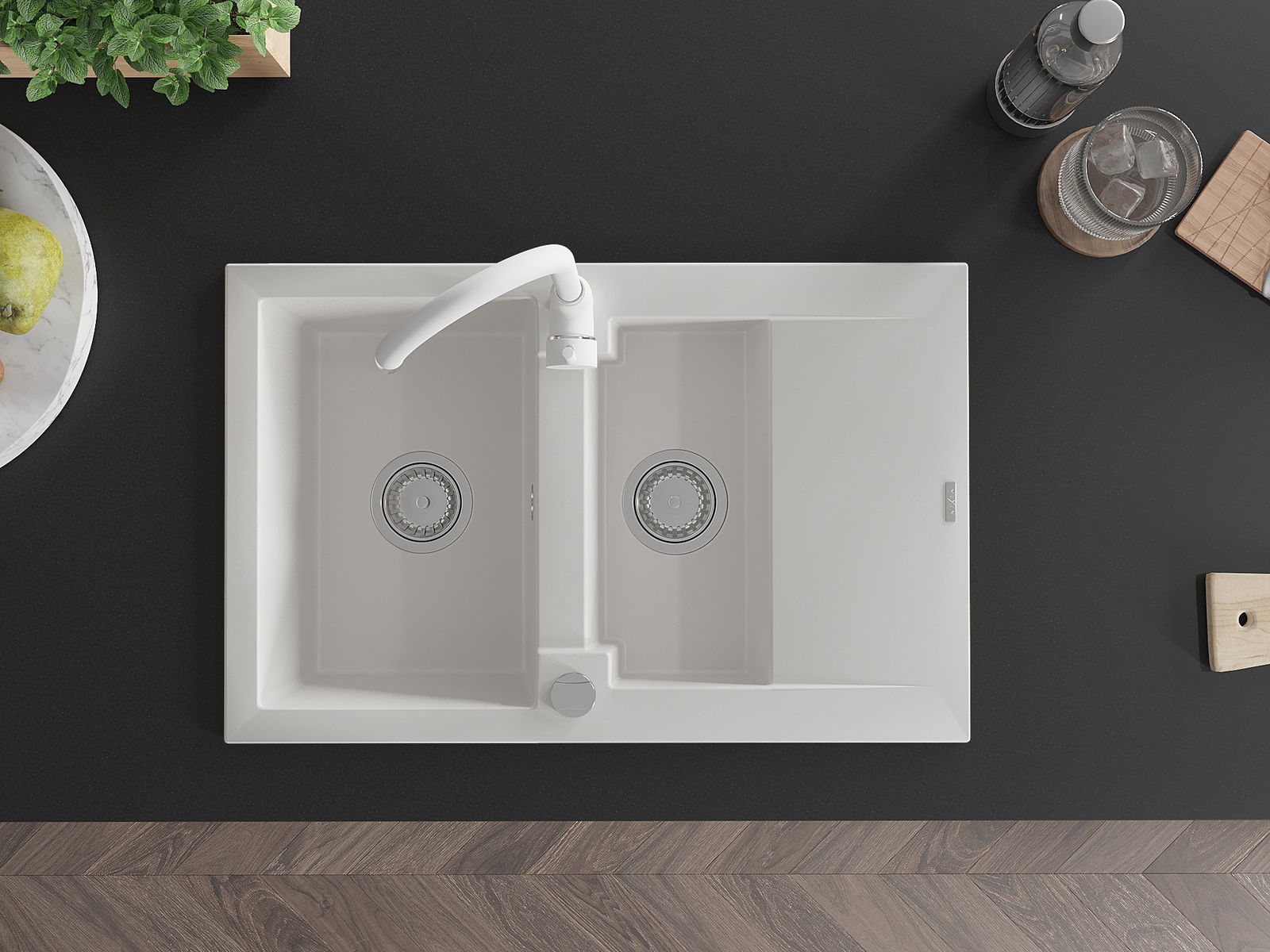 Mexen Gaspar évier en granit 1,5-bac avec égouttoir et robinet de cuisine Telma, blanc - 6507-20-670200-20