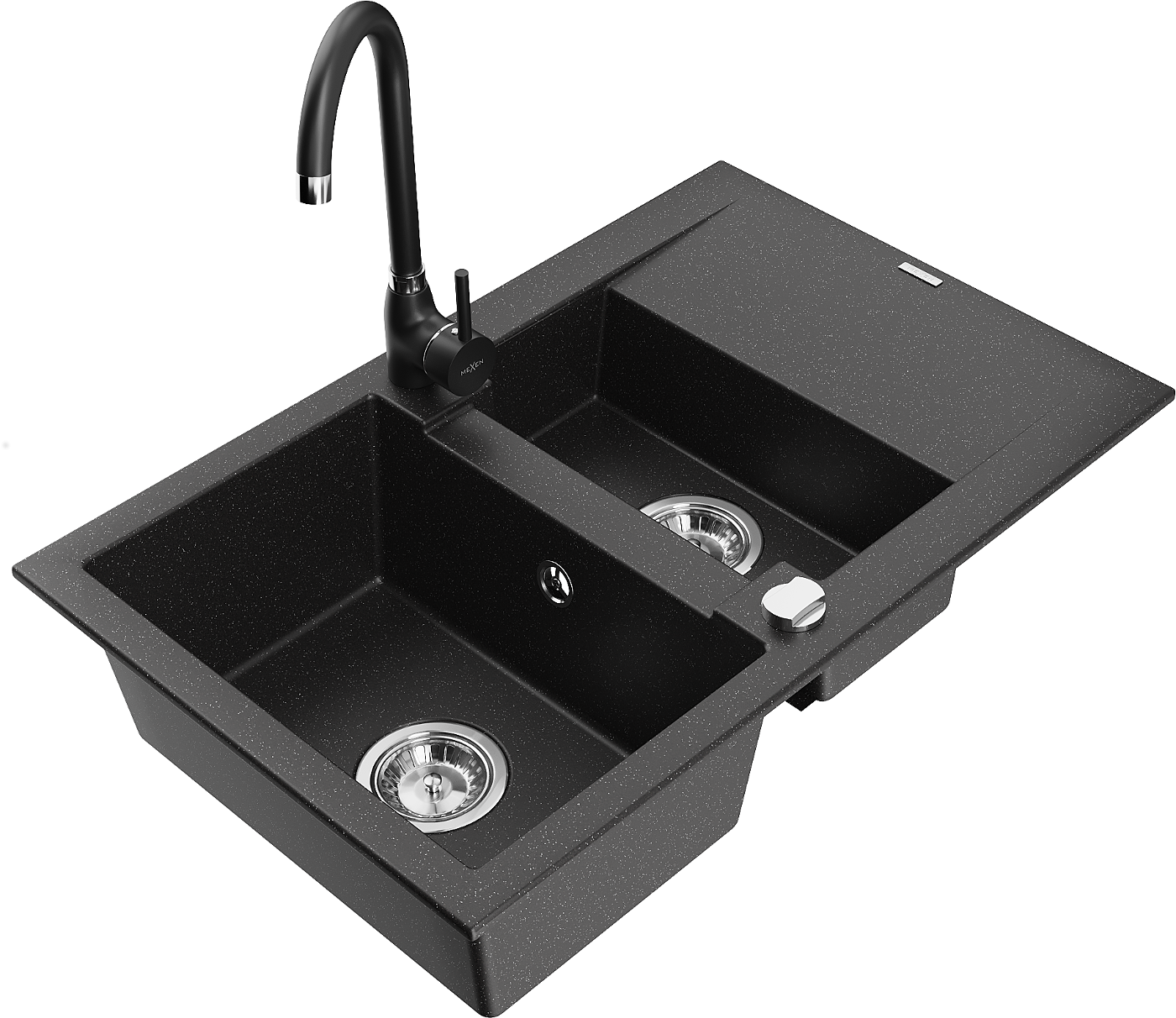 Mexen Gaspar évier en granit 1,5 bac avec égouttoir et robinet de cuisine Telma, noir/argent - 6507-73-670200-70