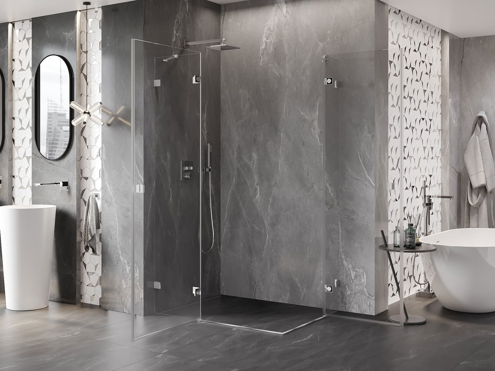 La poignée pratique et confortable est fabriquée en métal durable et résistant. Sa forme à la mode, combinée à une finition assortie à la couleur des profilés, donne à l'ensemble un aspect moderne et stylé, soulignant l'esthétique de chaque salle de bain.