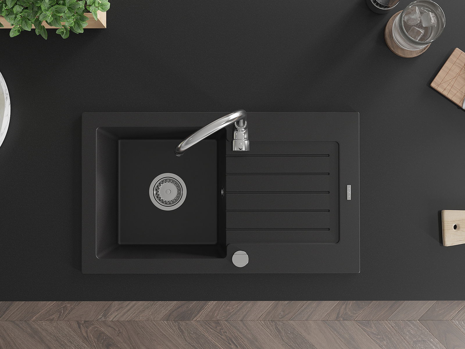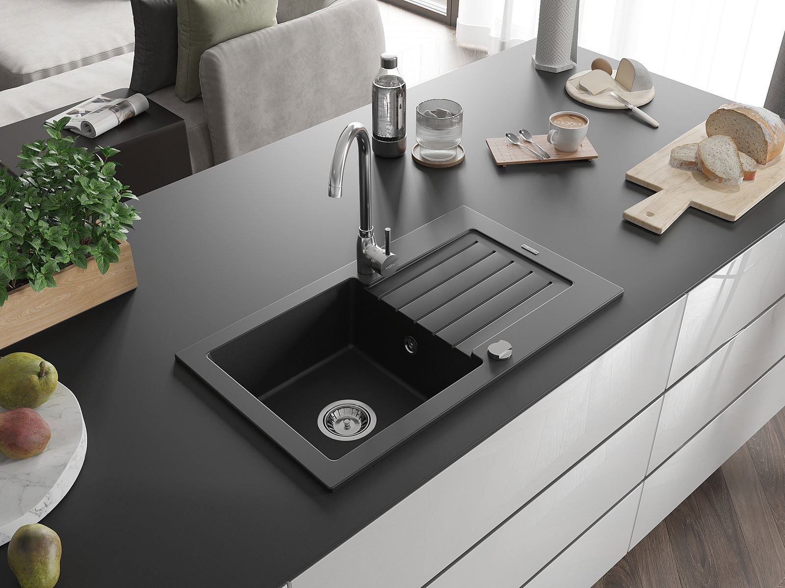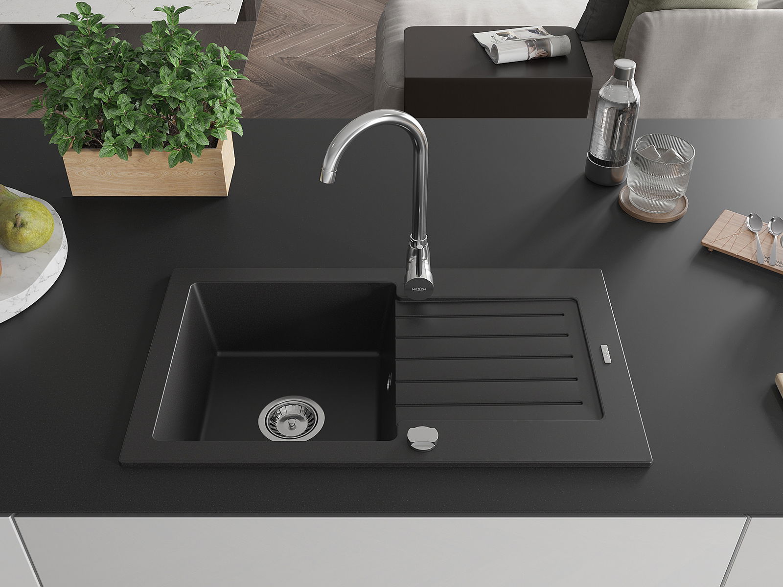 Mexen Pablo évier en granit 1 bac avec égouttoir et robinet de cuisine Telma, noir - 6510-77-670200-00
