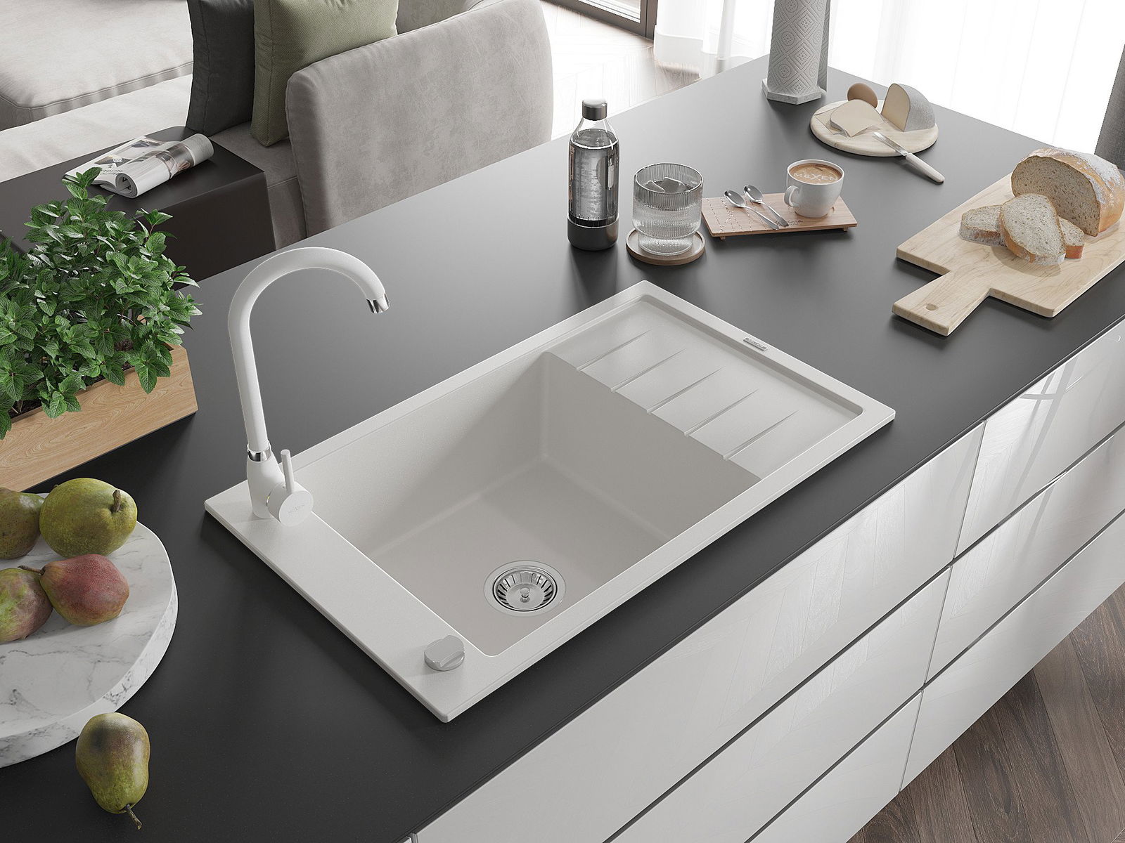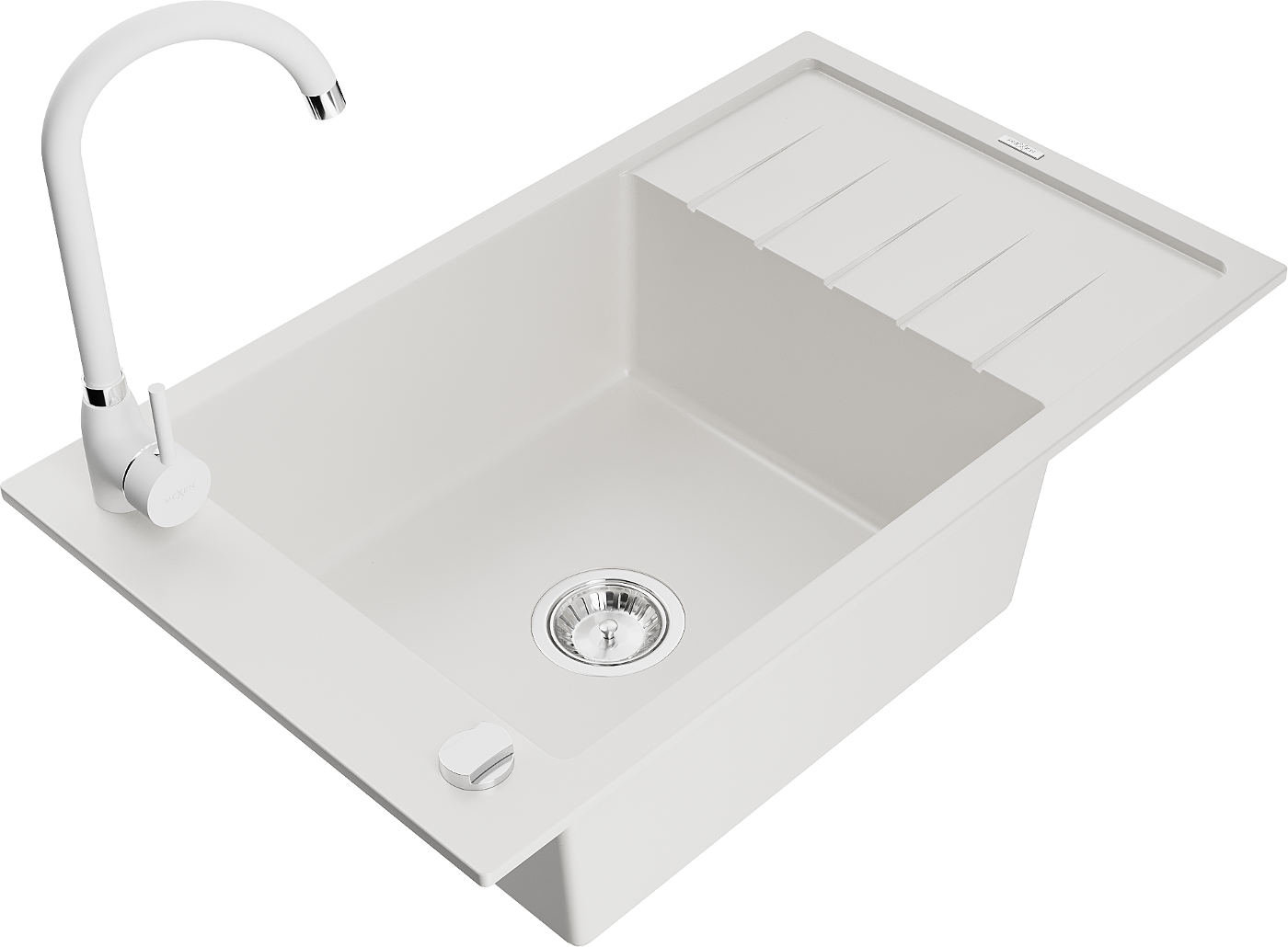 Mexen Elias évier en granit 1 bac avec égouttoir et robinet de cuisine Telma, blanc - 6511-20-670200-20