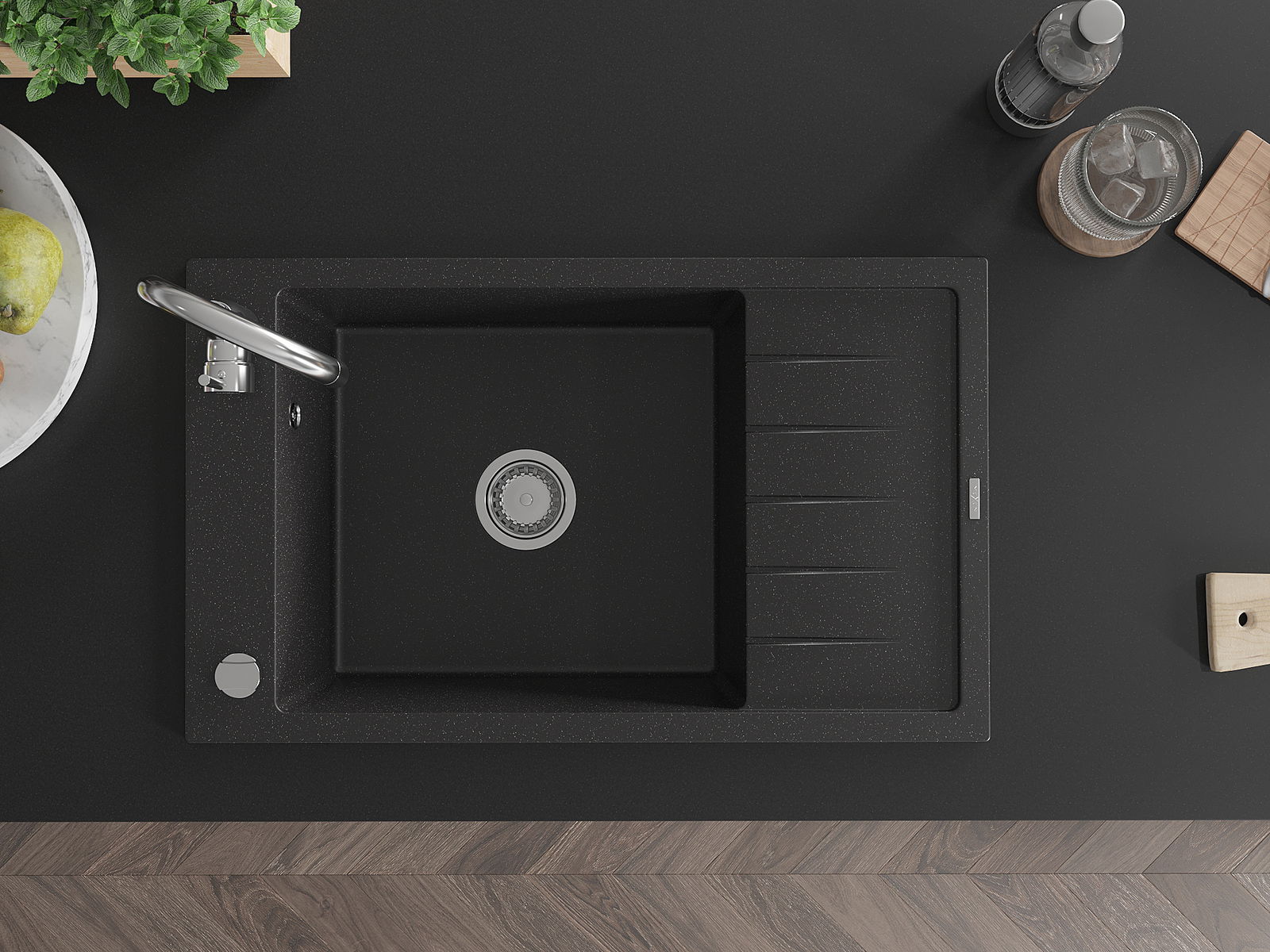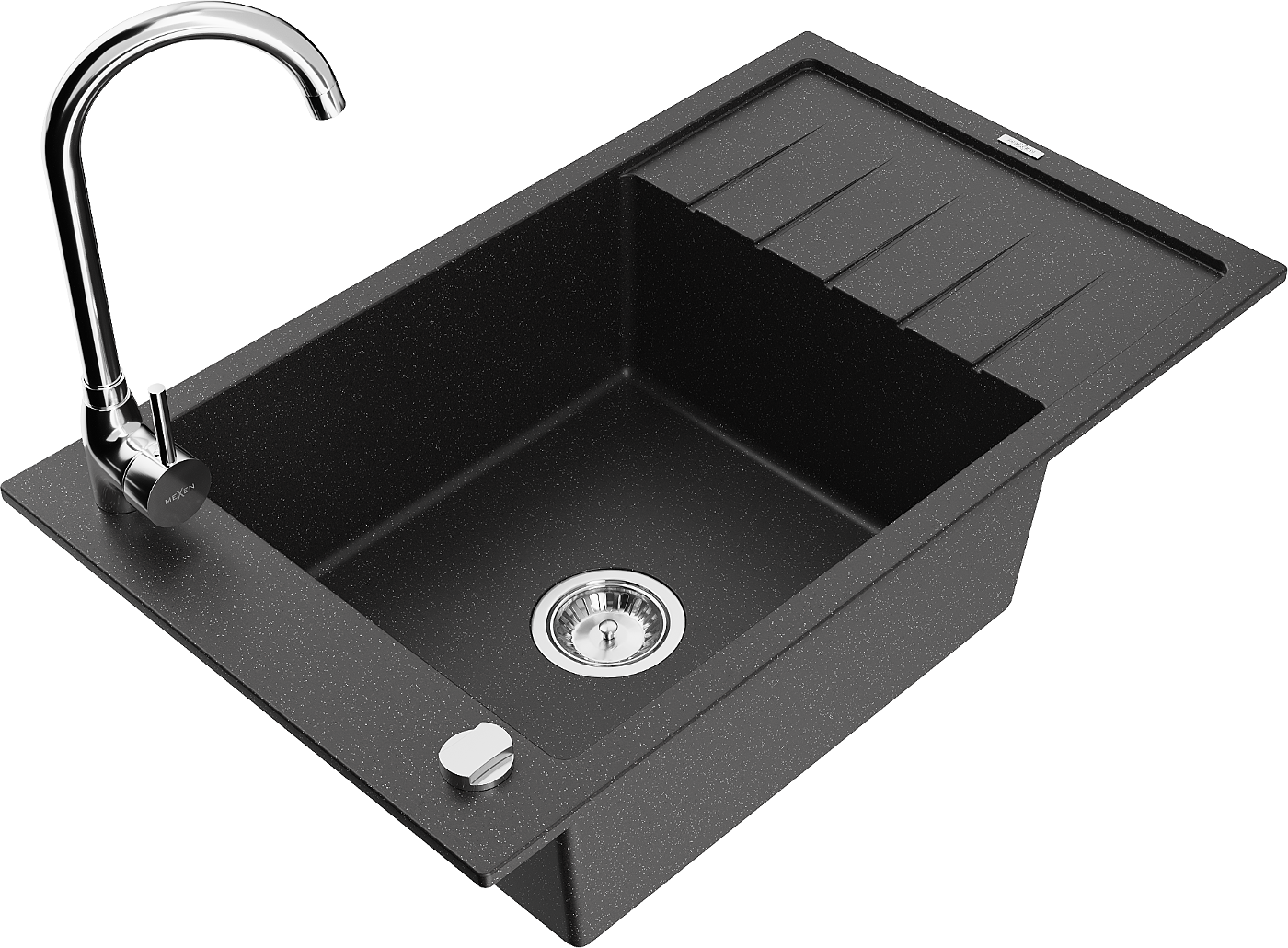 Mexen Elias évier en granit 1 bac avec égouttoir et robinet de cuisine Telma, noir/argent - 6511-73-670200-00