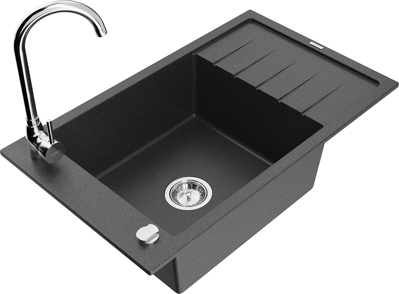 Mexen Elias évier en granit 1 cuve avec égouttoir et robinet de cuisine Telma, noir moucheté - 6511-76-670200-00