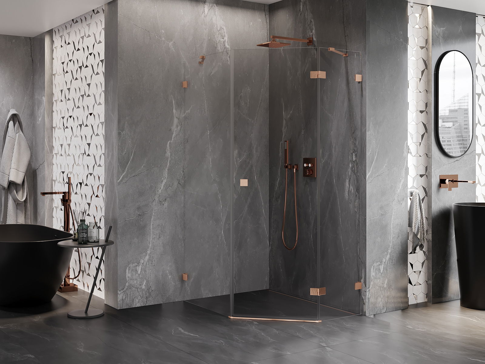 Mexen Lunar cabine de douche pentagonale pivotante droite 80 x 100 cm, transparent, cuivre brossé - 831-080P-100L-65-00-P