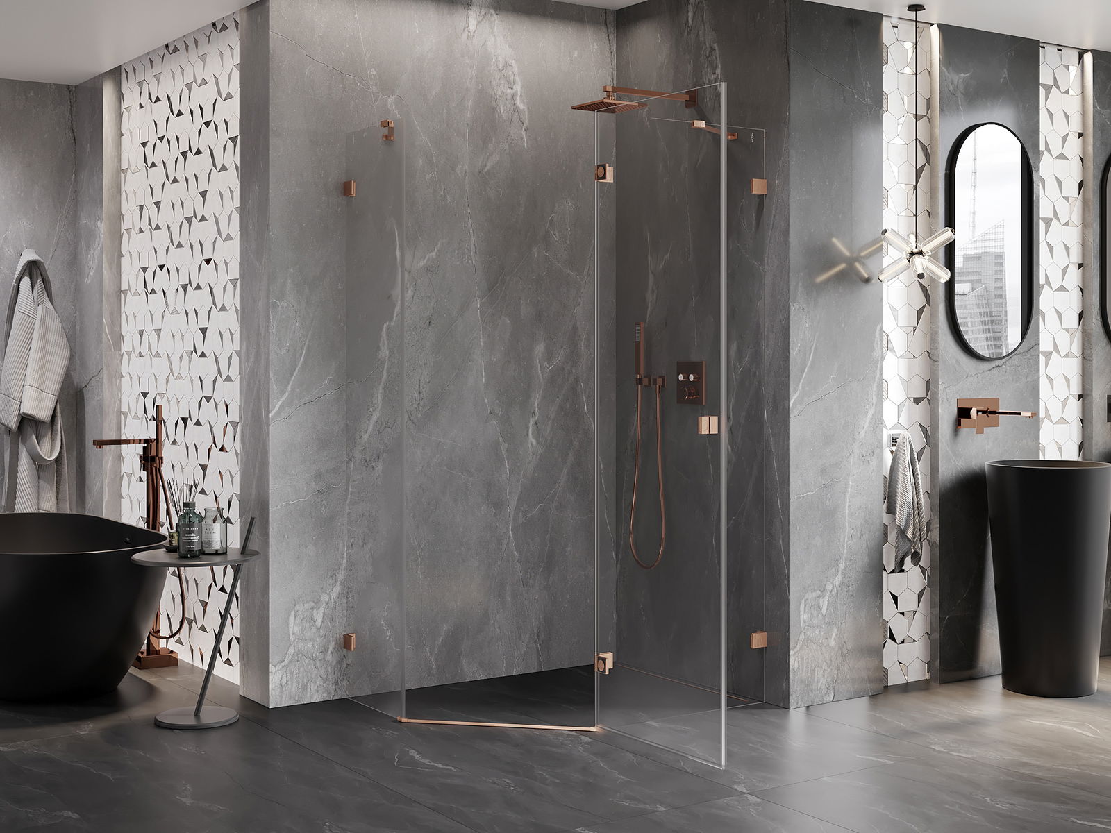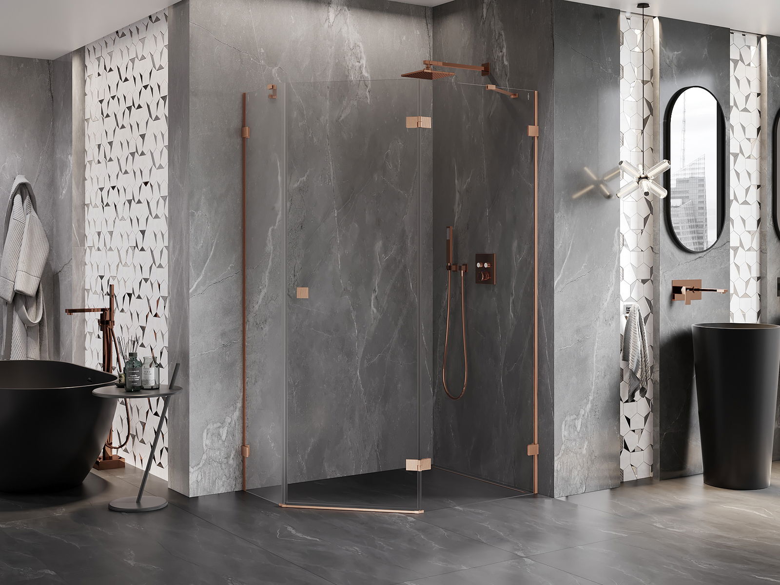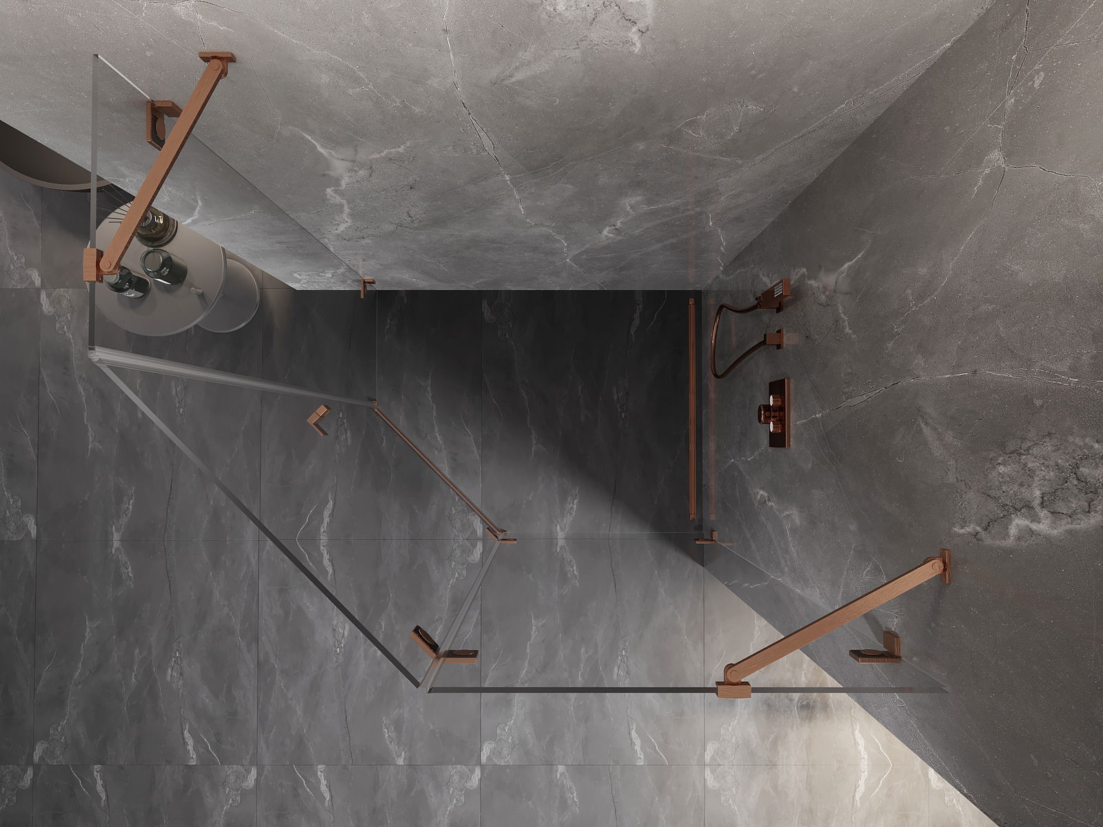 Mexen Lunar cabine de douche pentagonale pivotante droite 90 x 80 cm, transparent, cuivre brossé - 831-090P-080L-65-00-P