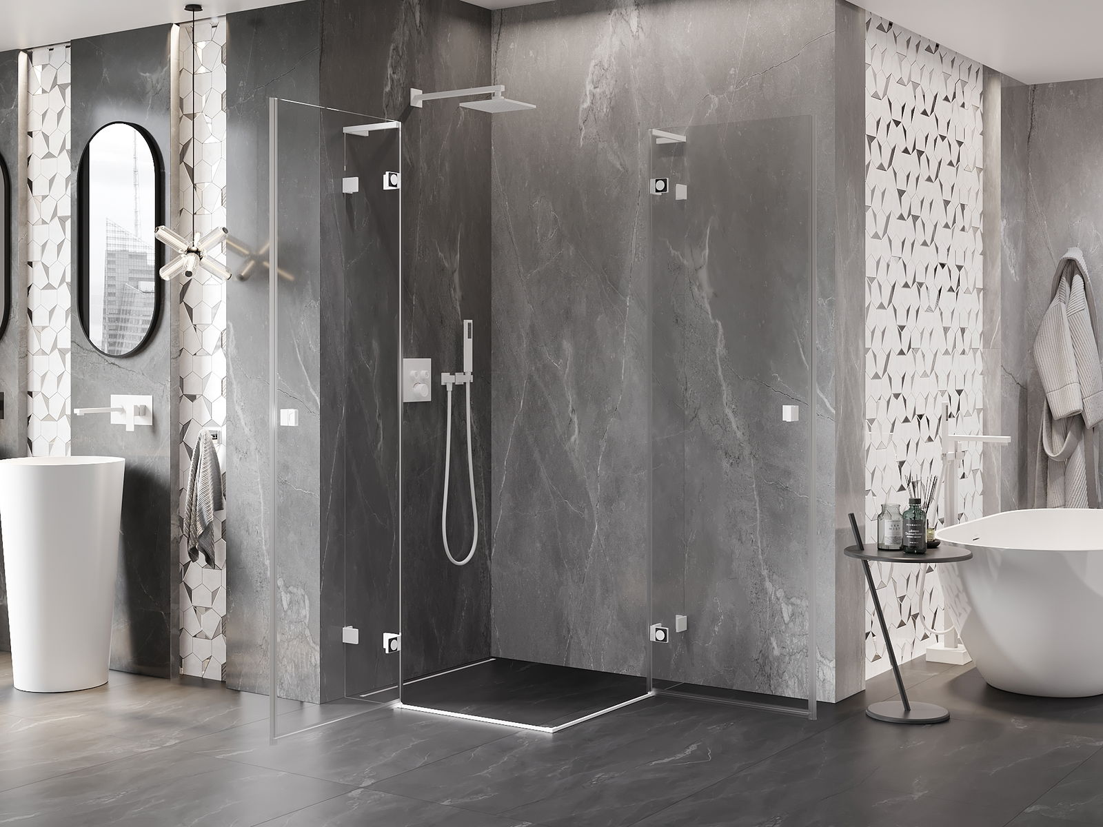 La poignée pratique et confortable est fabriquée en métal durable et résistant. Sa forme à la mode, combinée à une finition assortie à la couleur des profilés, donne à l'ensemble un aspect moderne et stylé, soulignant l'esthétique de chaque salle de bain.