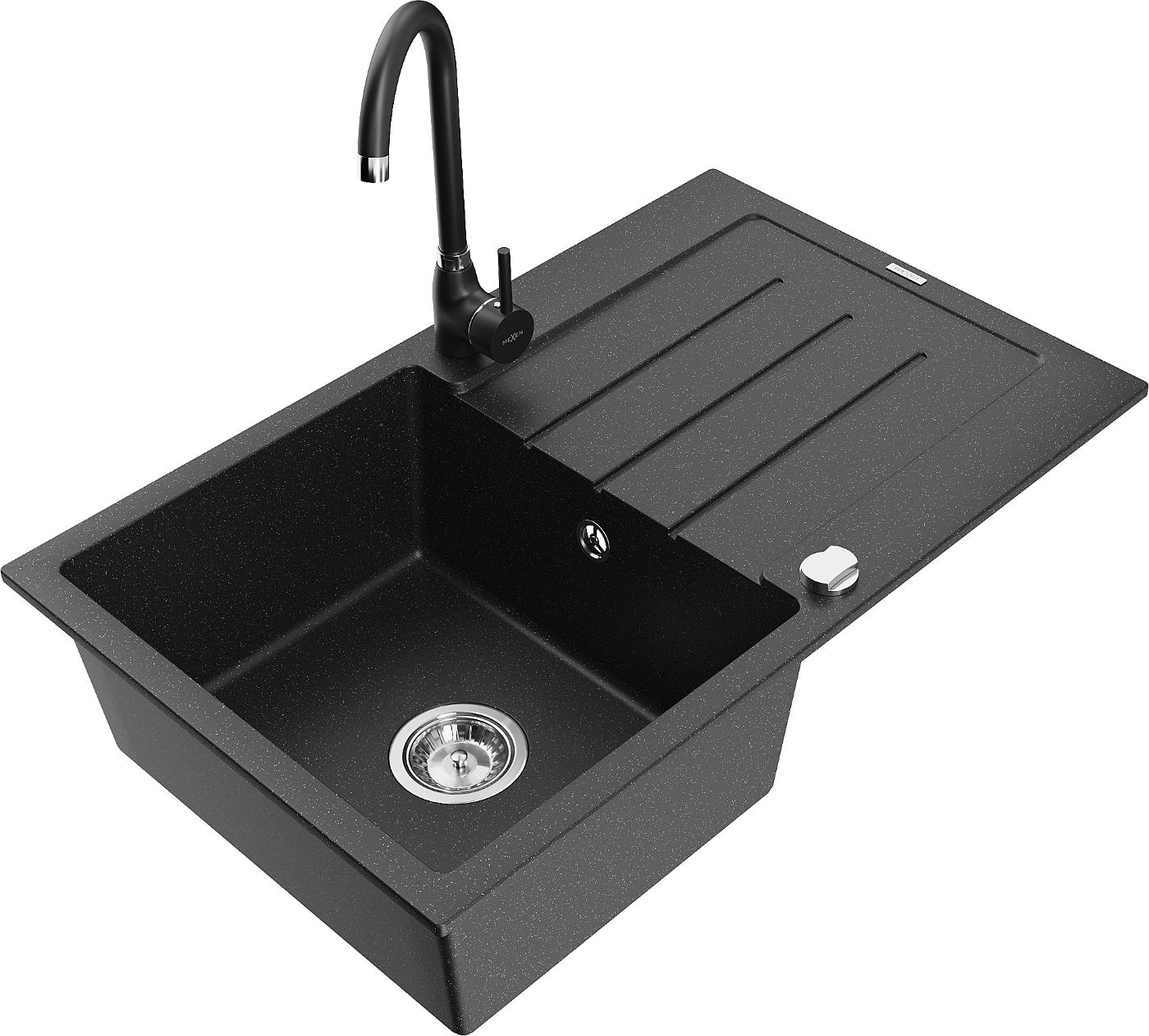 Mexen Bruno évier en granit 1 bac avec égouttoir et robinet de cuisine Telma, noir/argent - 6513-73-670200-70