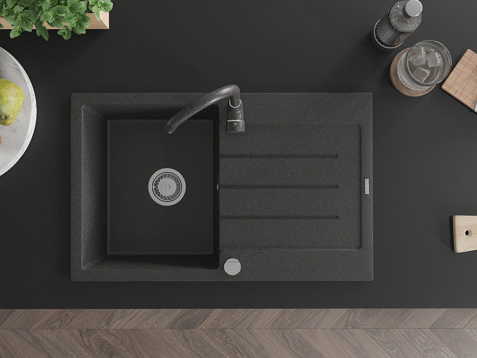 Mexen Bruno évier en granit 1 bac avec égouttoir et robinet de cuisine Telma, noir moucheté - 6513-76-670200-76