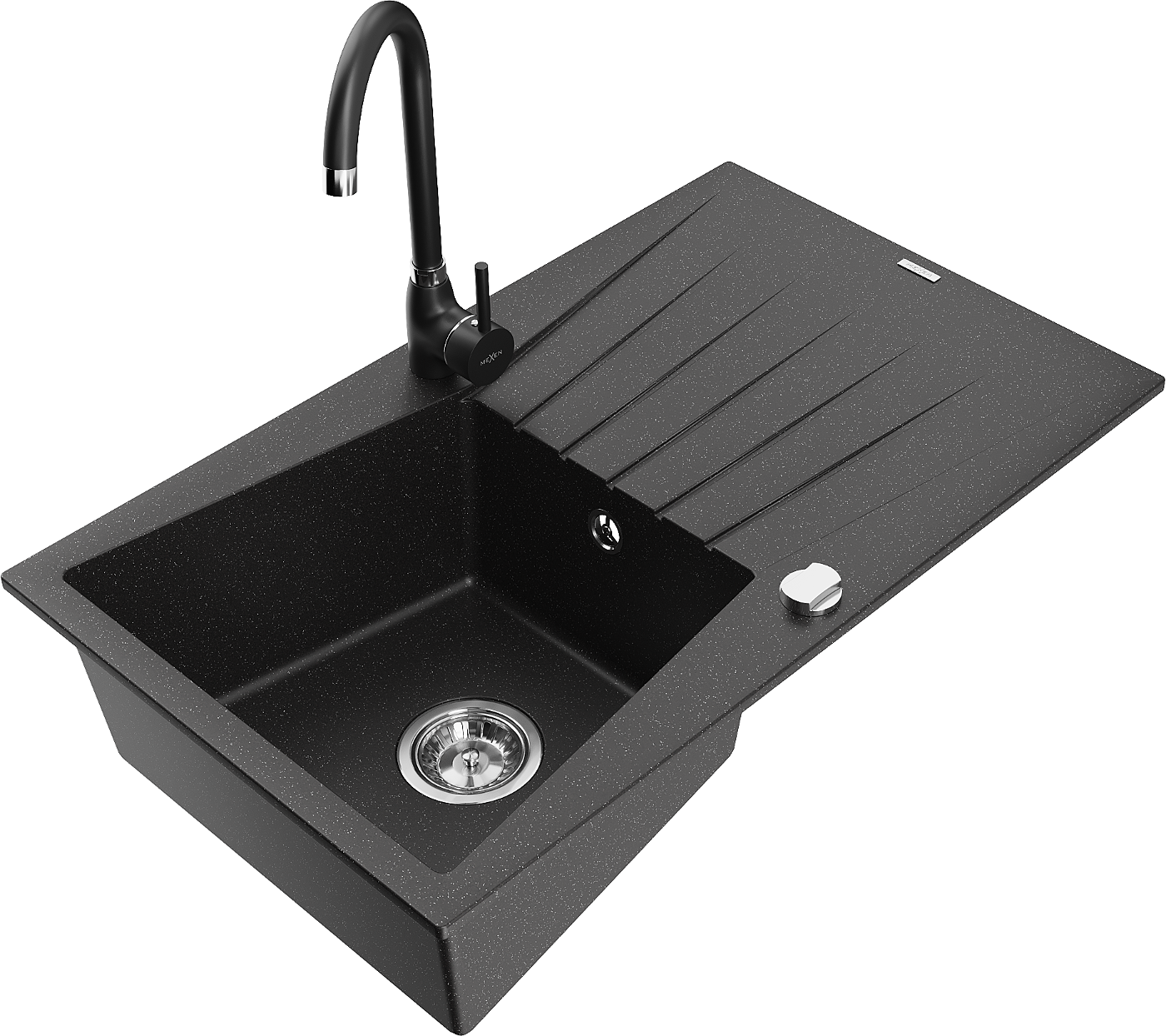 Mexen Cesar évier de cuisine en granit 1 bac avec égouttoir et mitigeur Telma, noir/argent - 6514-73-670200-70