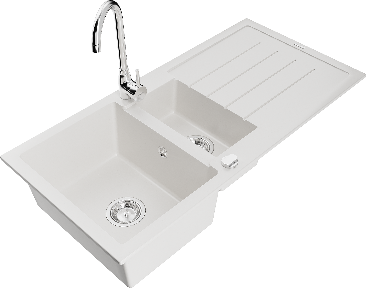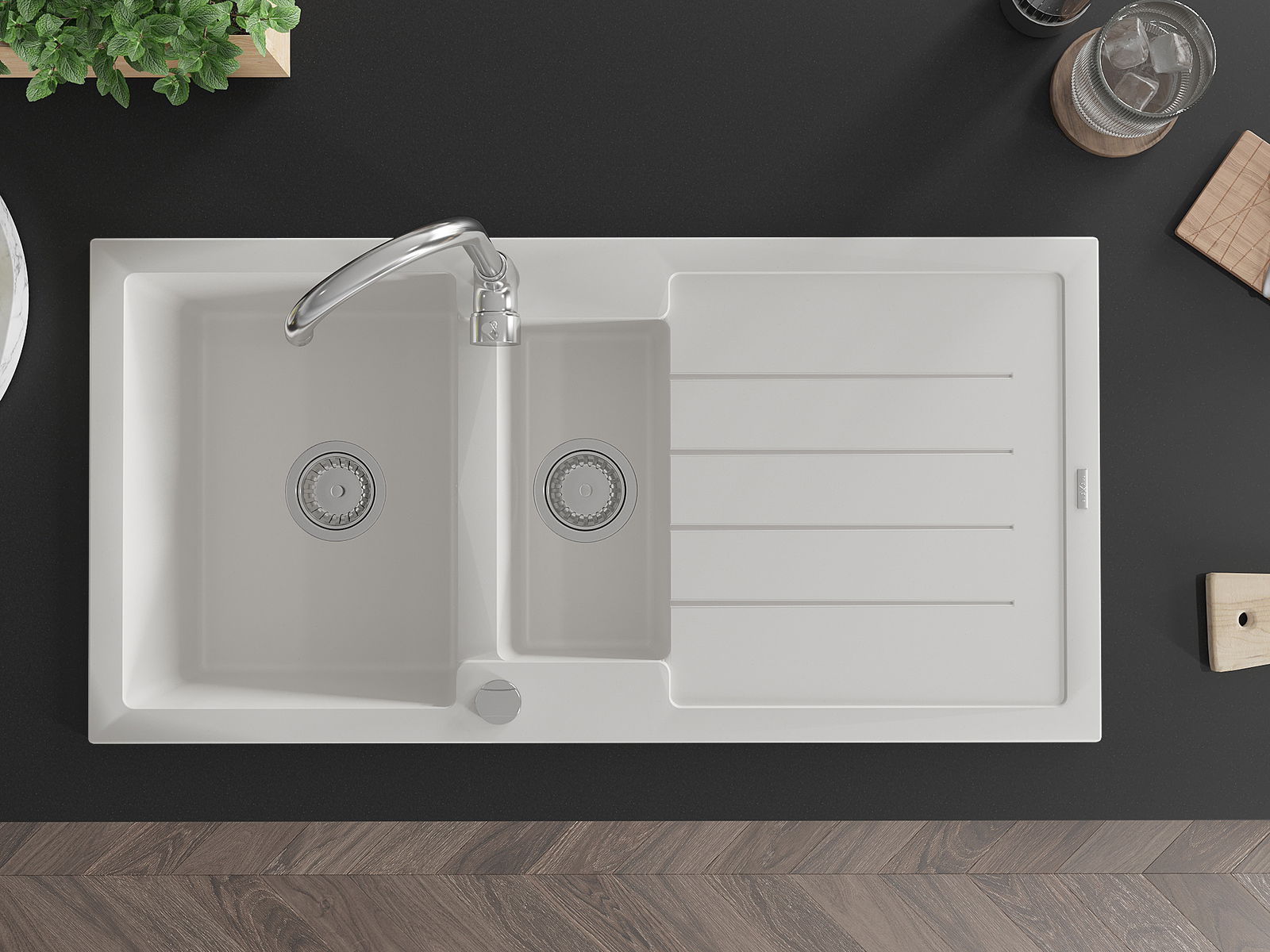 Mexen Andres évier en granit 1,5 bac avec égouttoir et robinet de cuisine Telma, blanc - 6515-20-670200-00