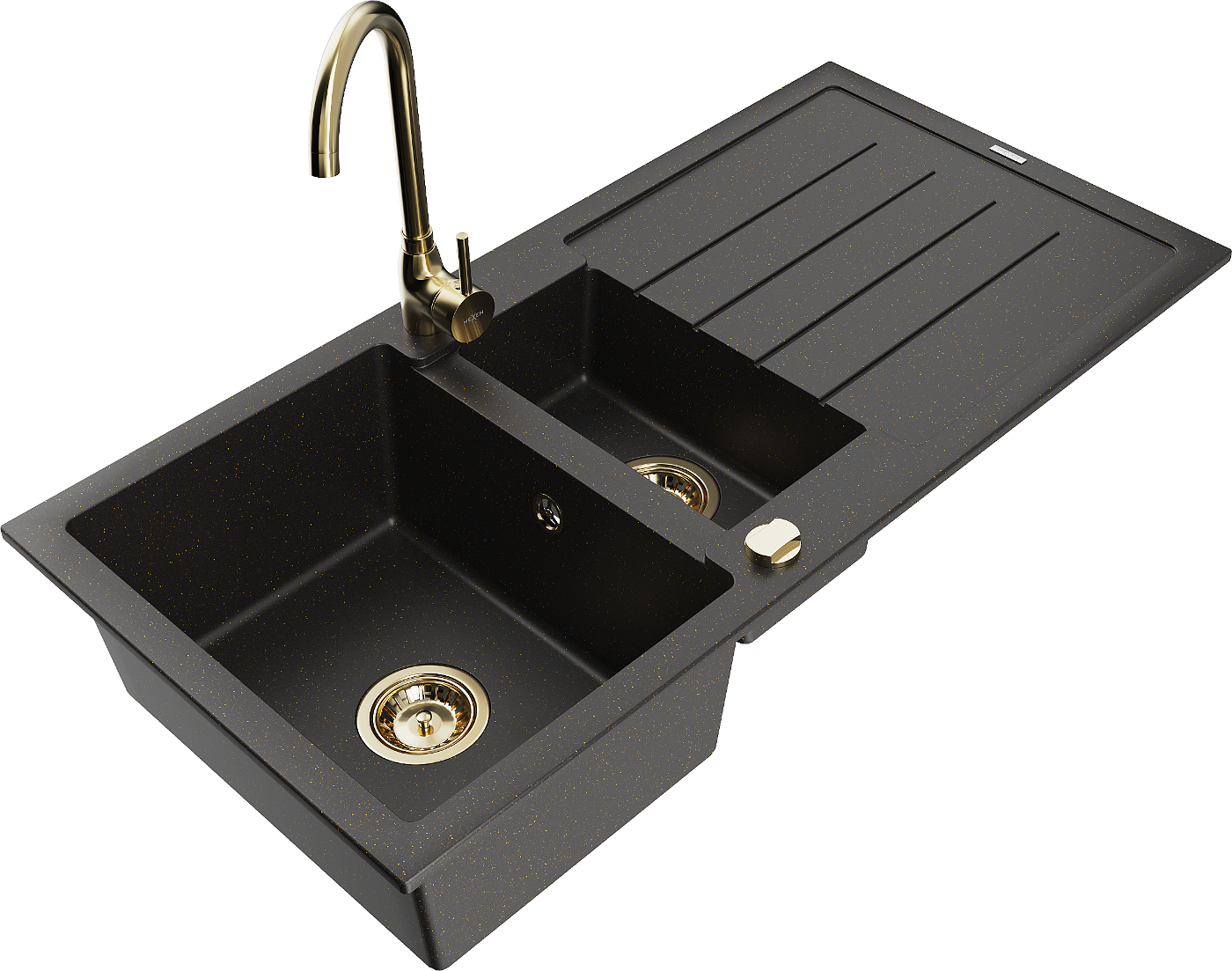 Mexen Andres évier en granit 1,5 bac avec égouttoir et robinet de cuisine Telma, noir/doré - 6515-75-670200-50