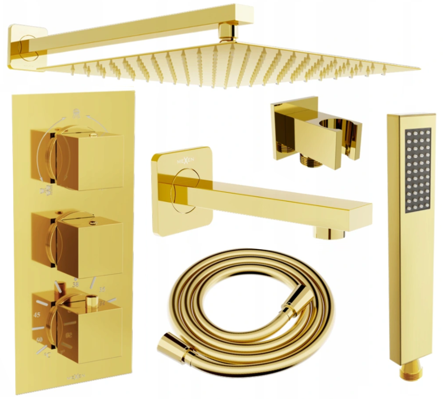 Mexen Cube DR02 ensemble de baignoire-douche encastré avec pomme de douche 30 cm, doré - 77503DR0230-50