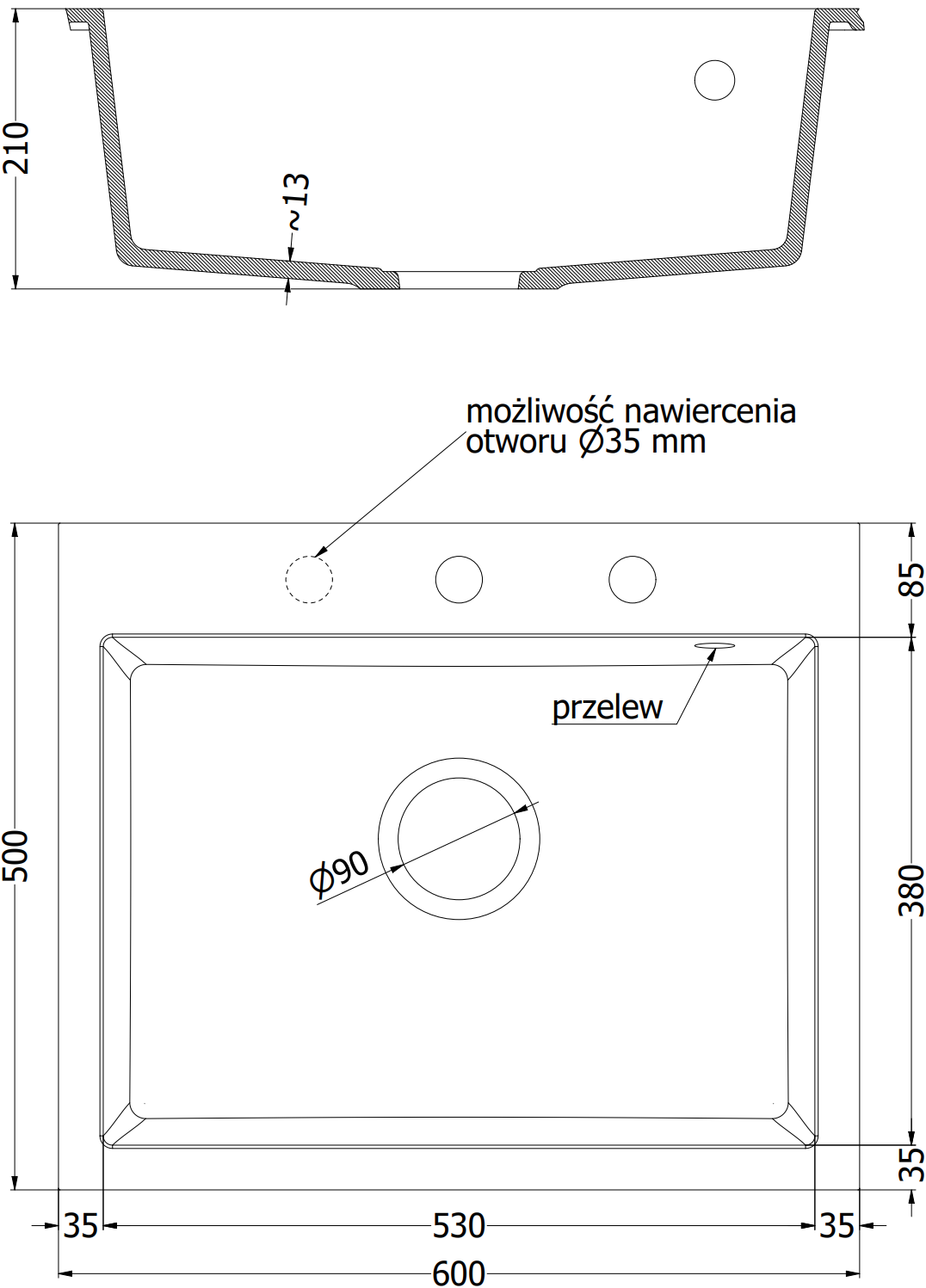 L'évier a un trou sous-meulé de 35 mm de diamètre à percer soi-même. Il peut être utilisé, entre autres, pour installer un distributeur de liquide, ce qui éliminera la présence de bouteilles en plastique dans la cuisine et lui donnera une finition élégante.