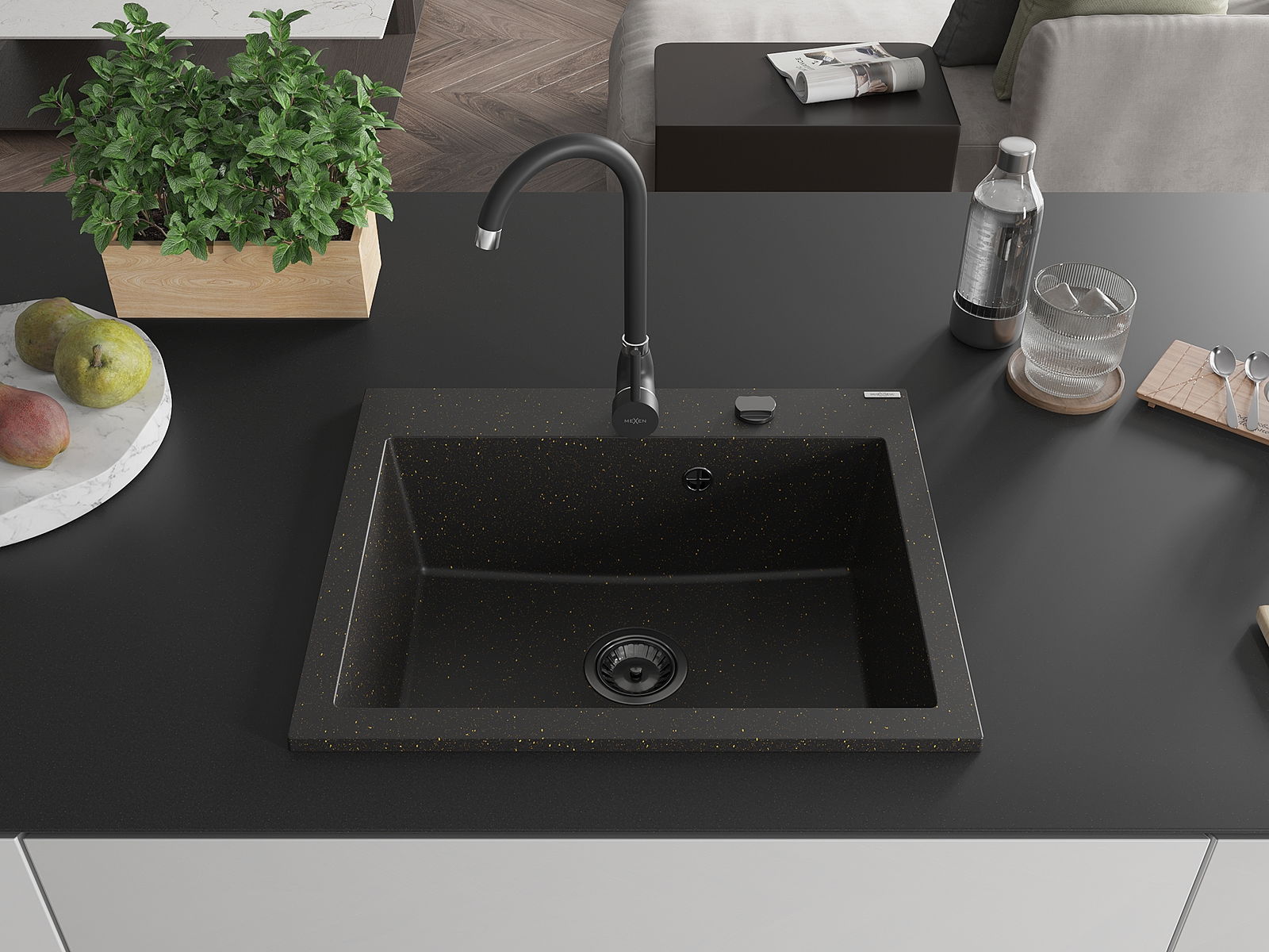 Mexen Elix évier en granit 1 bac 600 x 500 mm, noir/doré métallisé, siphon noir - 6525601005-75-B