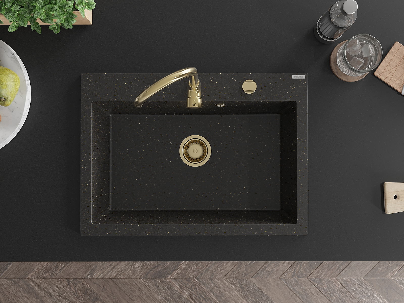 Mexen Elix évier en granit 1 bac 700 x 500 mm, noir/métallique doré, siphon doré - 6526701005-75-G