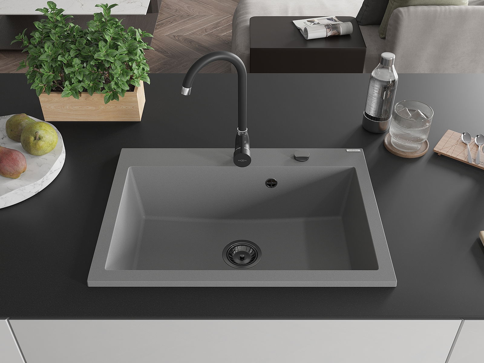 Mexen Elix évier en granit 1 bac 700 x 500 mm, gris, siphon noir - 6526701005-71-B