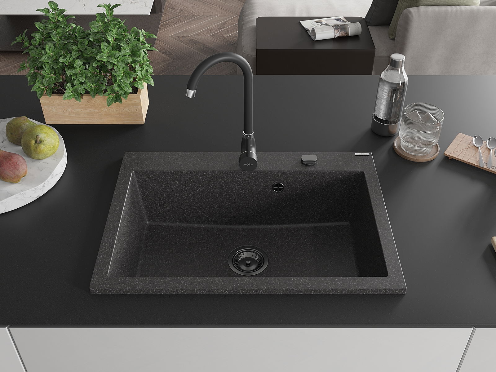 Mexen Elix évier en granit 1 bac 700 x 500 mm, noir moucheté, siphon noir - 6526701005-76-B