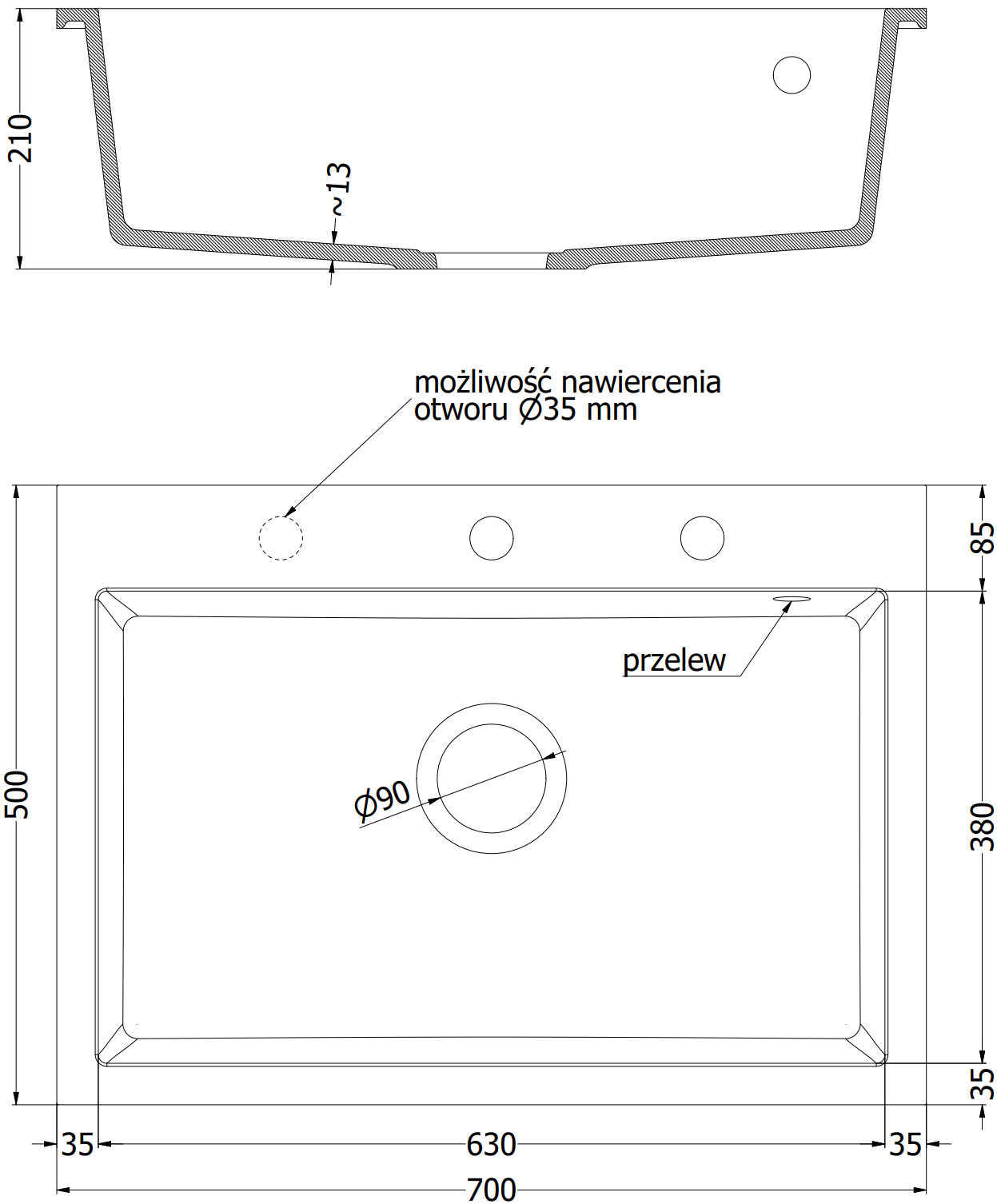 L'évier a un trou sous-meulé de 35 mm de diamètre à percer soi-même. Il peut être utilisé, entre autres, pour installer un distributeur de liquide, ce qui éliminera la présence de bouteilles en plastique dans la cuisine et lui donnera une finition élégante.