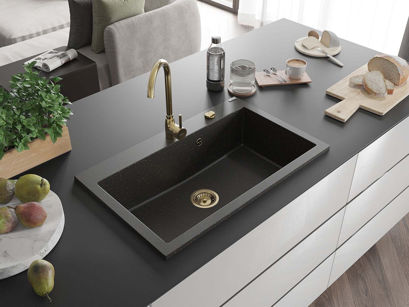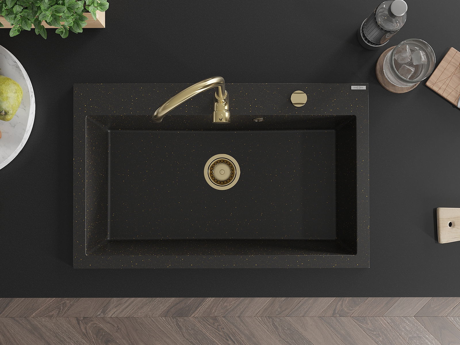 Mexen Elix évier en granit 1 bac 800 x 500 mm, noir/or métallique, siphon doré - 6527801005-75-G