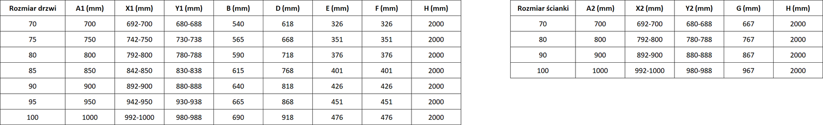 Taille : 95x70 cm (porte droite 95 cm, paroi 70 cm)