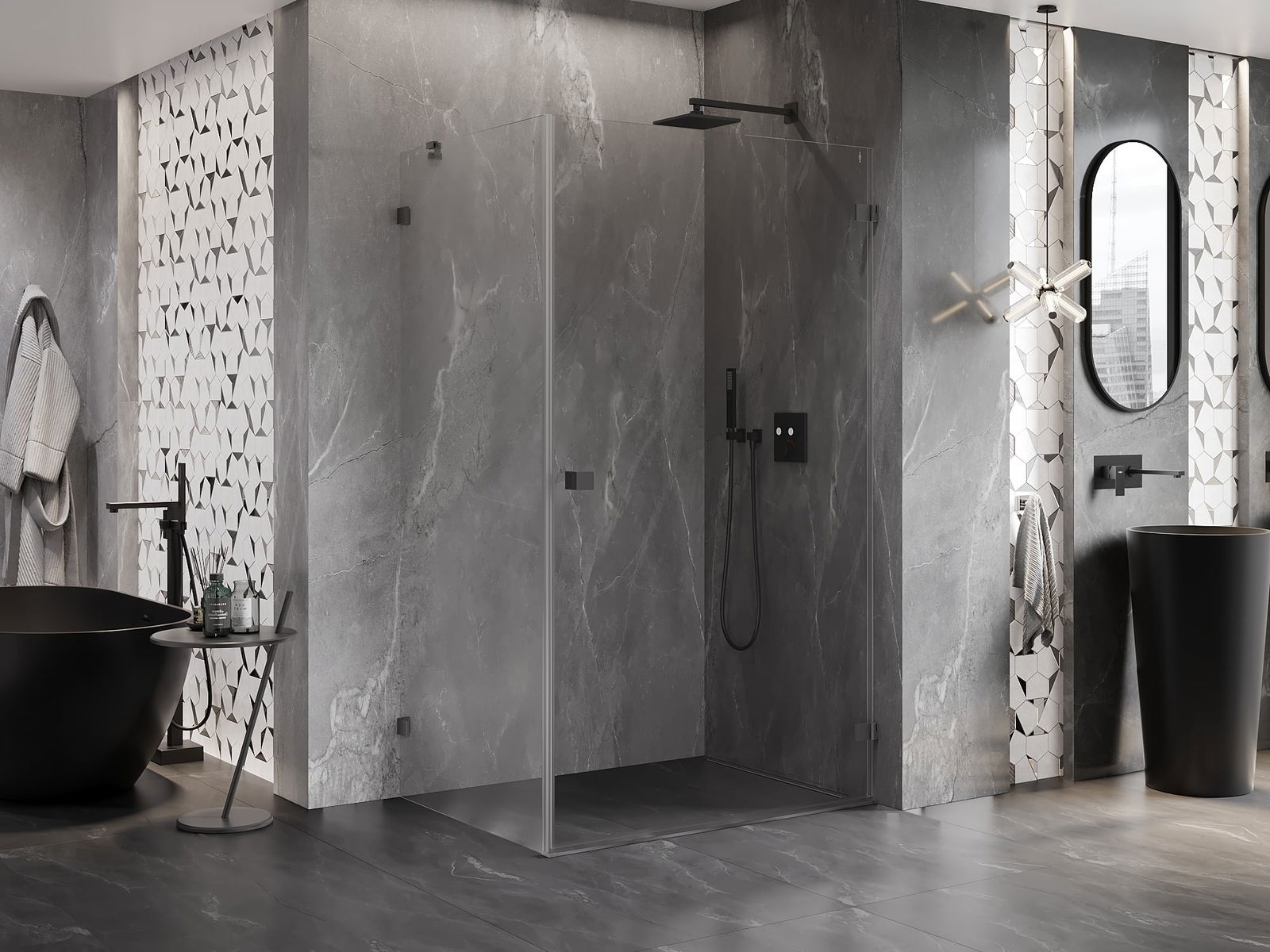La poignée pratique et confortable est fabriquée en métal durable et résistant. Sa forme à la mode, combinée à une finition assortie à la couleur des profilés, donne à l'ensemble un aspect moderne et stylé, soulignant l'esthétique de chaque salle de bain.