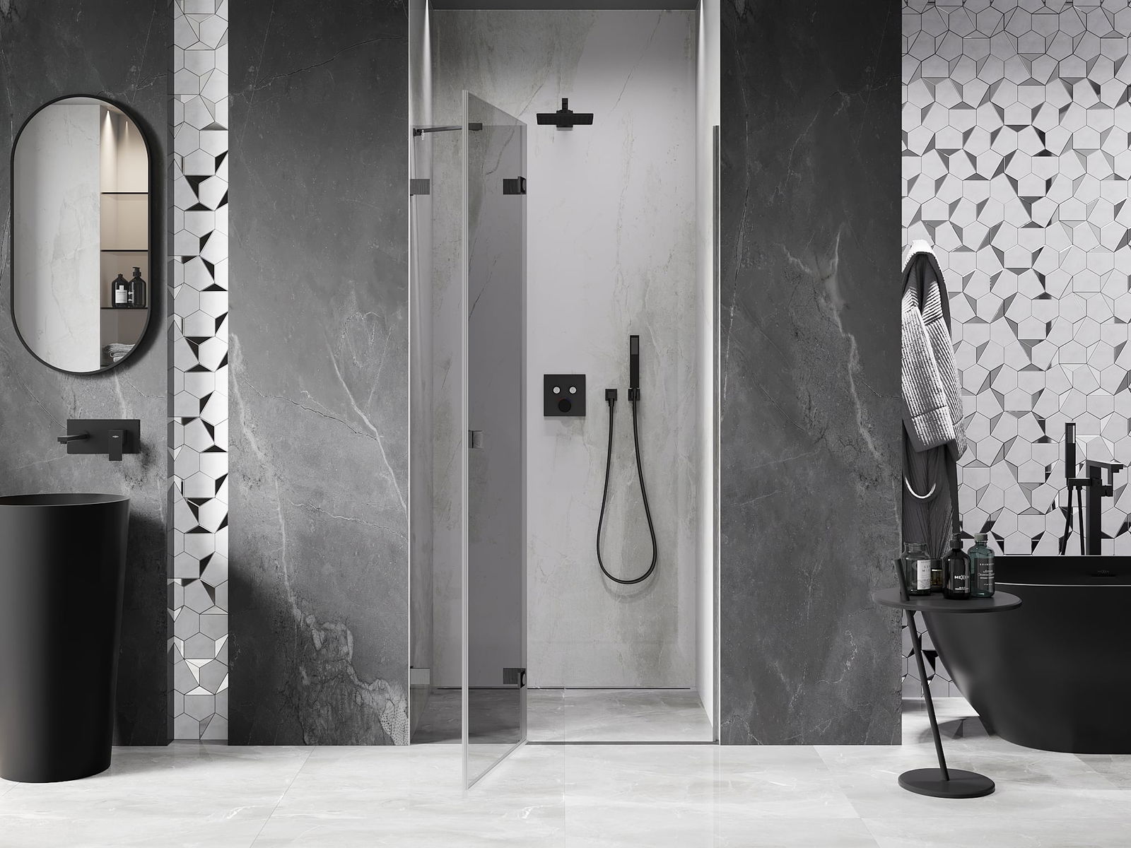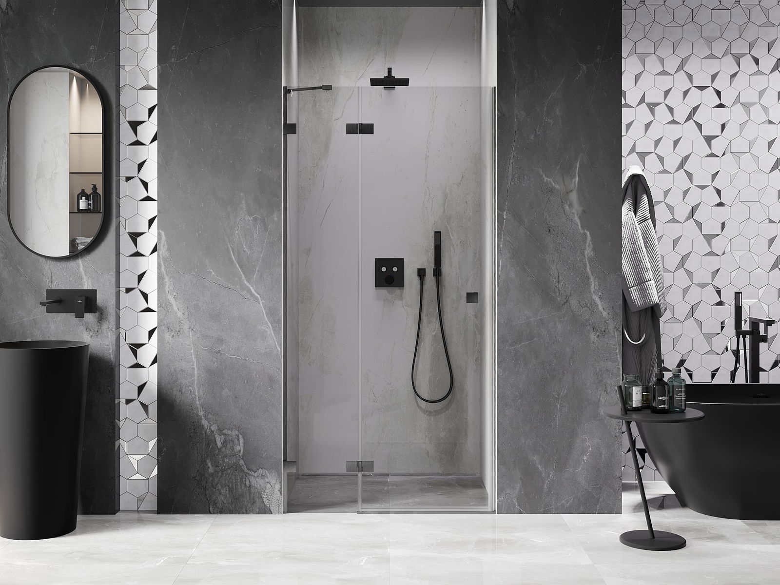 La poignée pratique et confortable est fabriquée en métal durable et résistant. Sa forme à la mode, combinée à une finition assortie à la couleur des profilés, donne à l'ensemble un aspect moderne et stylé, soulignant l'esthétique de chaque salle de bain.