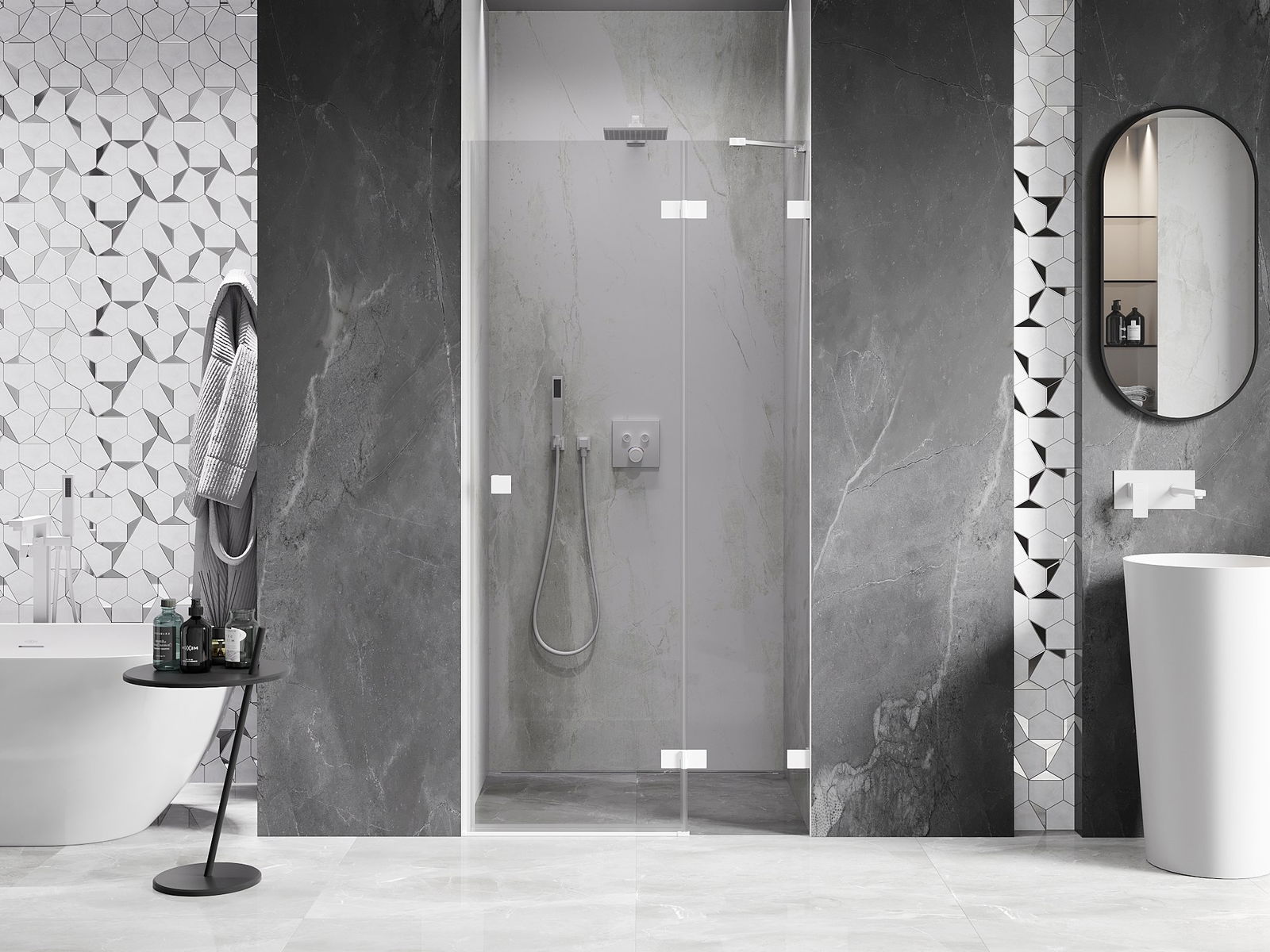 La poignée pratique et confortable est fabriquée en métal durable et résistant. Sa forme à la mode, combinée à une finition assortie à la couleur des profilés, donne à l'ensemble un aspect moderne et stylé, soulignant l'esthétique de chaque salle de bain.