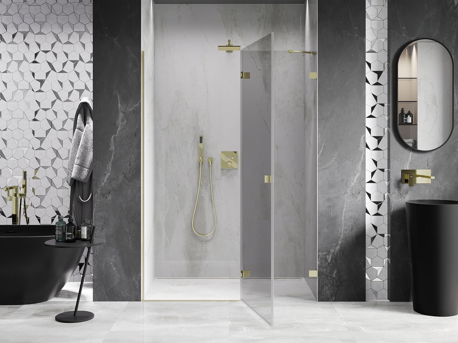 La poignée pratique et confortable est fabriquée en métal durable et résistant. Sa forme à la mode, combinée à une finition assortie à la couleur des profilés, donne à l'ensemble un aspect moderne et stylé, soulignant l'esthétique de chaque salle de bain.