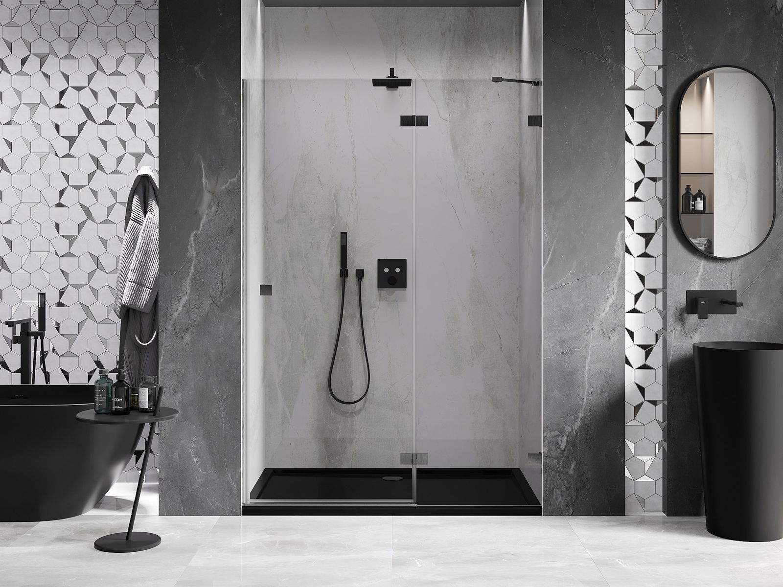 La poignée pratique et confortable est fabriquée en métal durable et résistant. Sa forme à la mode, combinée à une finition assortie à la couleur des profilés, donne à l'ensemble un aspect moderne et stylé, soulignant l'esthétique de chaque salle de bain.